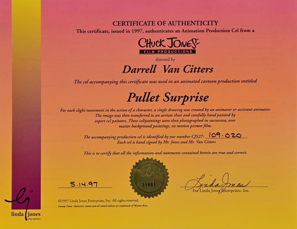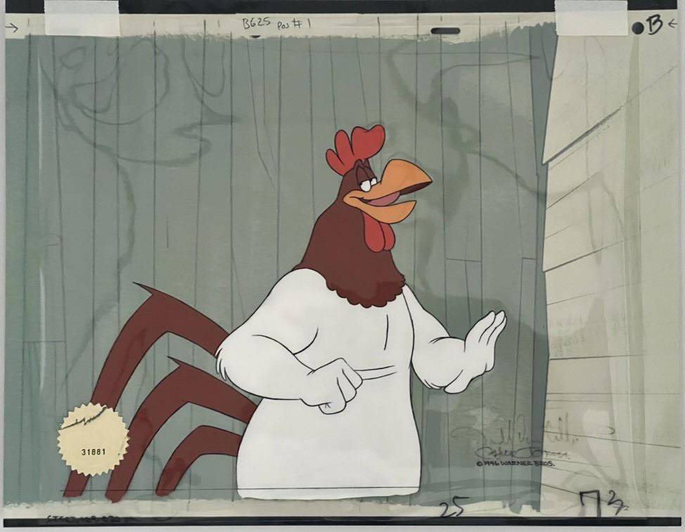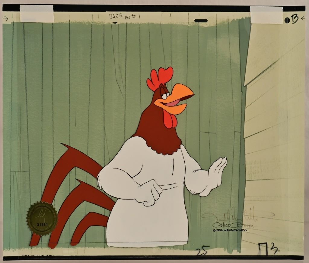 Foghorn Leghorn Warner Brothers animation production cel, 1996 double signed by animation legend, Chuck Jones and Darrell Van Citters, the director. With WB official cert. 11x14 inches. AK8