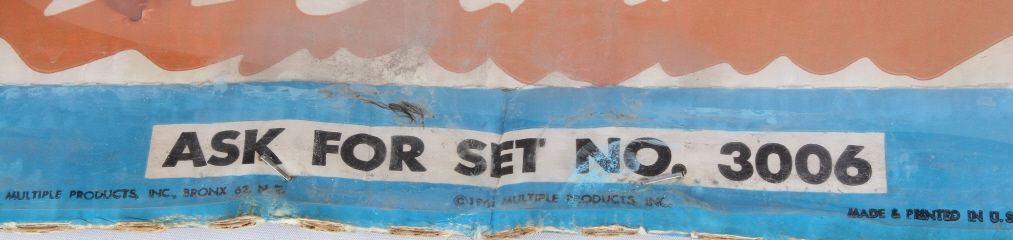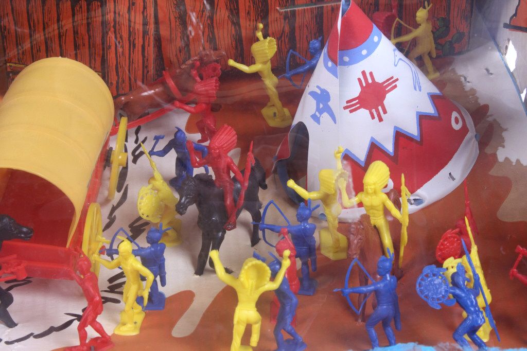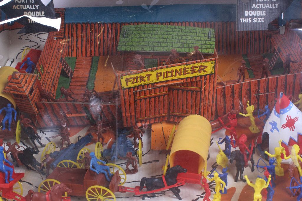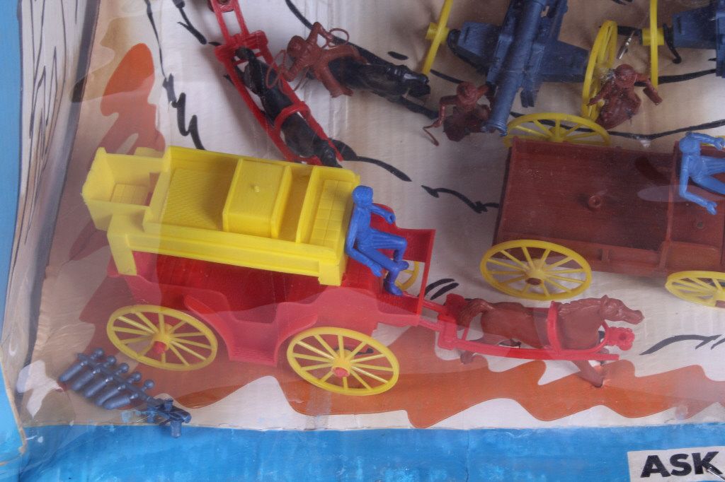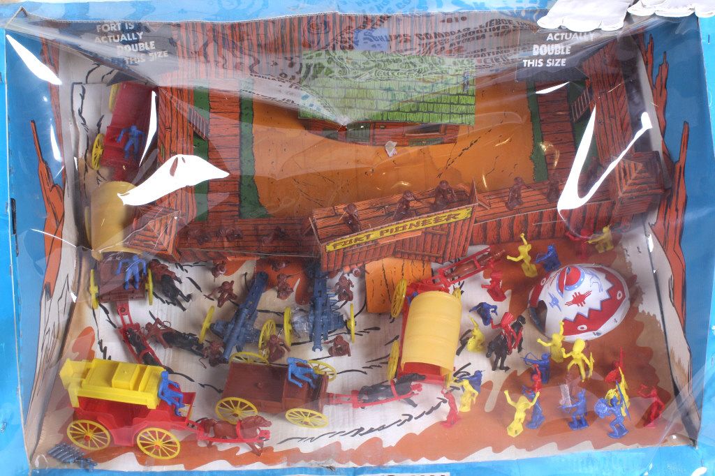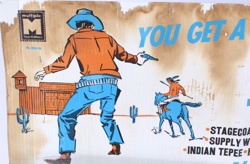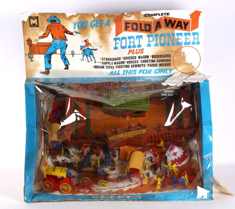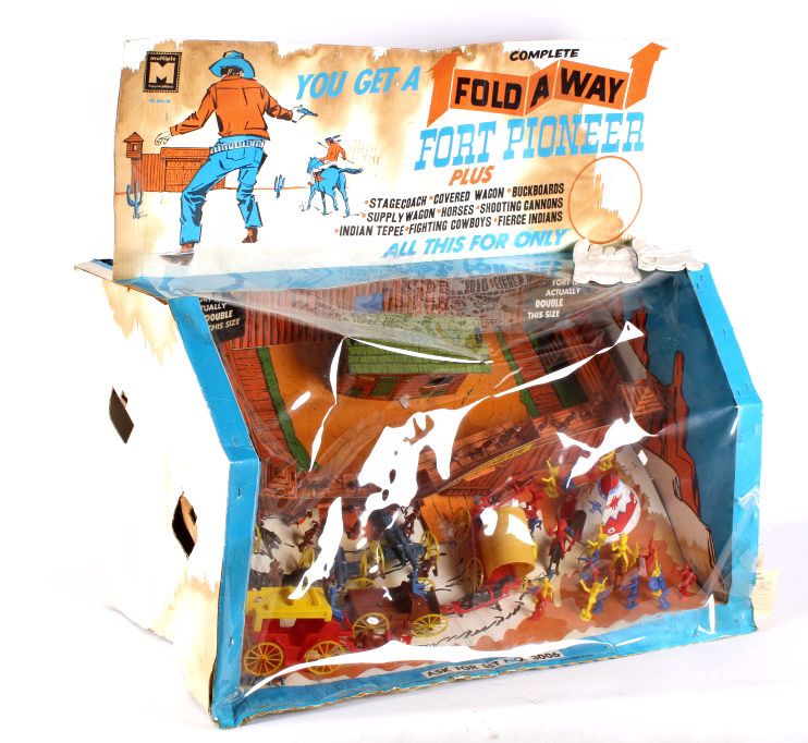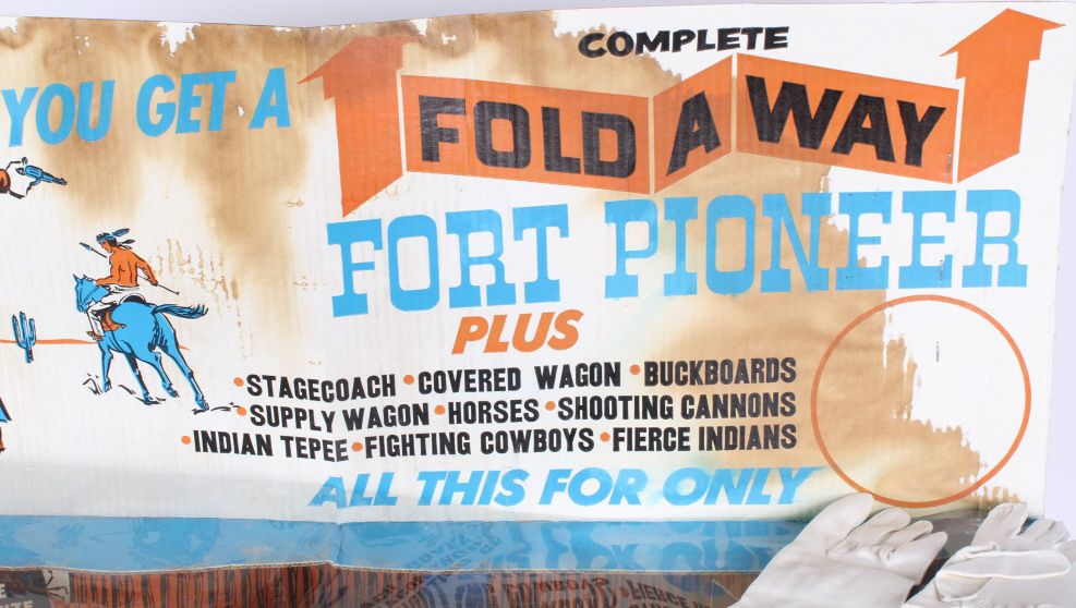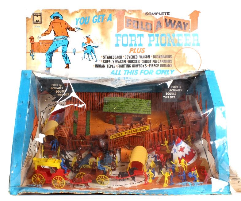 This is a store display Multiple Toy Makers Fort Pioneer Fold A Way No. 3006 set. This includes Cowboy & Indian toys, stagecoaches, horses, wagons, shooting canons, Indian tepee, and more. The piece has the original shipping box and is believed to be complete. The display shows some damage as it is mostly cardboard. Early vintage piece. Measures 32.25"x32.25"x20"