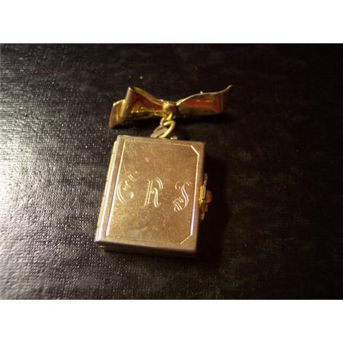 This is a cute pin that looks like a book when it is closed and then folds out where you can put pictures in.Has initials on the front of I believe CRS.Great condition,un-marked.Measures 1 3/4" tall.