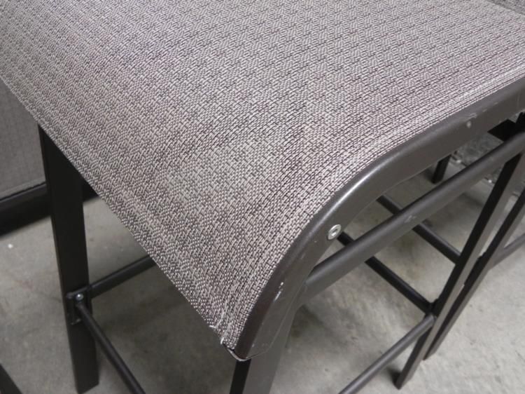 This is complete bar with three barstools, and the bar folds for easy storage. All pieces have lightweight dark brown metal structures, with durable tan woven fabric material. * * The table has a tempered glass top, and two metal shelves at the back side. The dimensions are 50 W x 40 H x 20 D inches. * The barstools have suspended material for comfortable seating. Each stool measures 29 H x 18 W x 16 D. * * Everything is in very good condition, with some light surface scuffs as shown. The fabric in front has a slight dent line. * * Whether you have this in your rec room, living room, or deck, this stylish modern bar will be a welcome site for your guests.