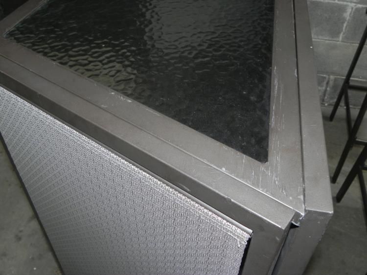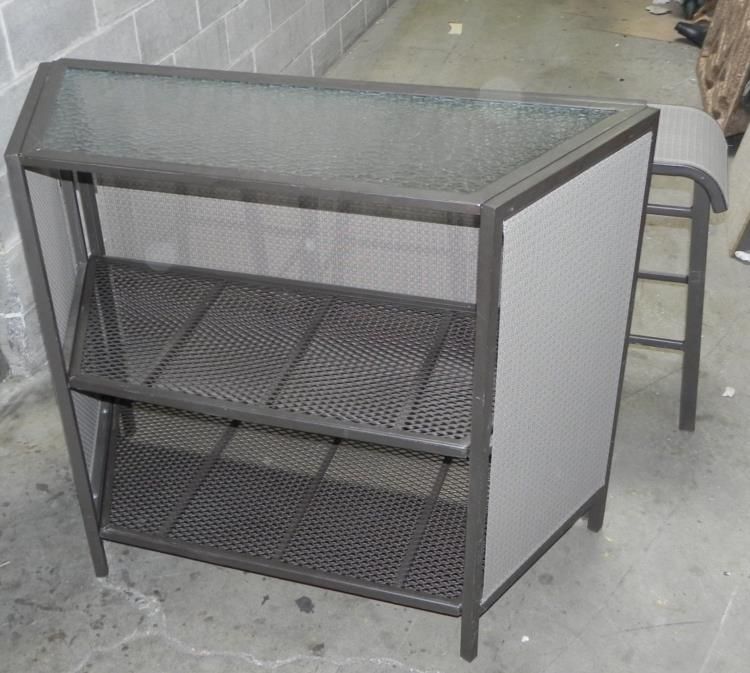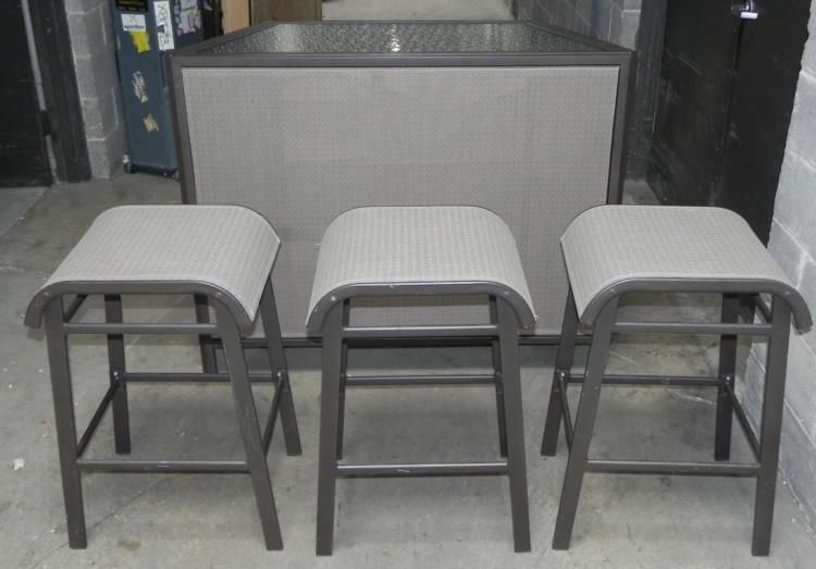 This is complete bar with three barstools, and the bar folds for easy storage. All pieces have lightweight dark brown metal structures, with durable tan woven fabric material. * * The table has a tempered glass top, and two metal shelves at the back side. The dimensions are 50 W x 40 H x 20 D inches. * The barstools have suspended material for comfortable seating. Each stool measures 29 H x 18 W x 16 D. * * Everything is in very good condition, with some light surface scuffs as shown. The fabric in front has a slight dent line. * * Whether you have this in your rec room, living room, or deck, this stylish modern bar will be a welcome site for your guests.