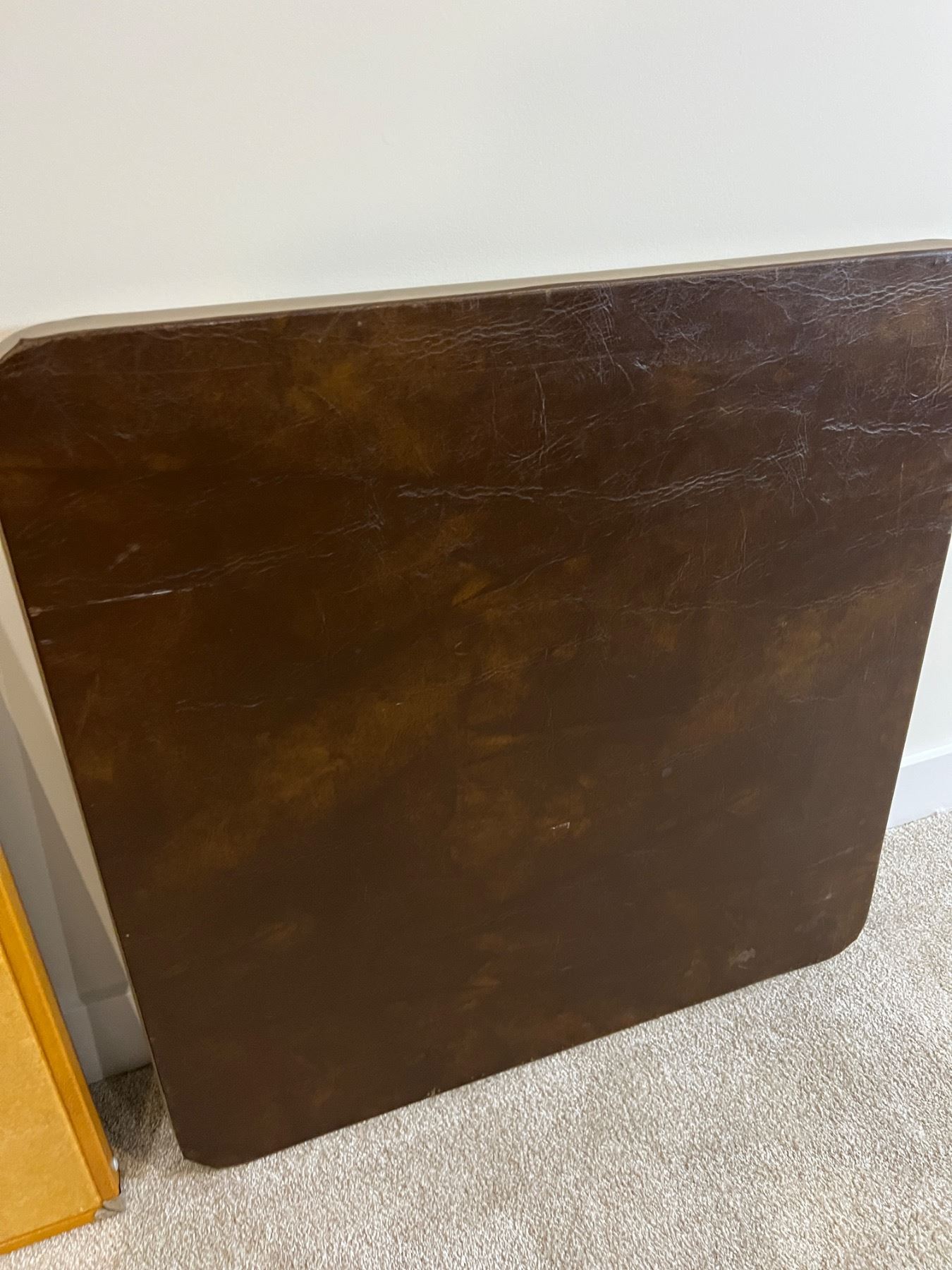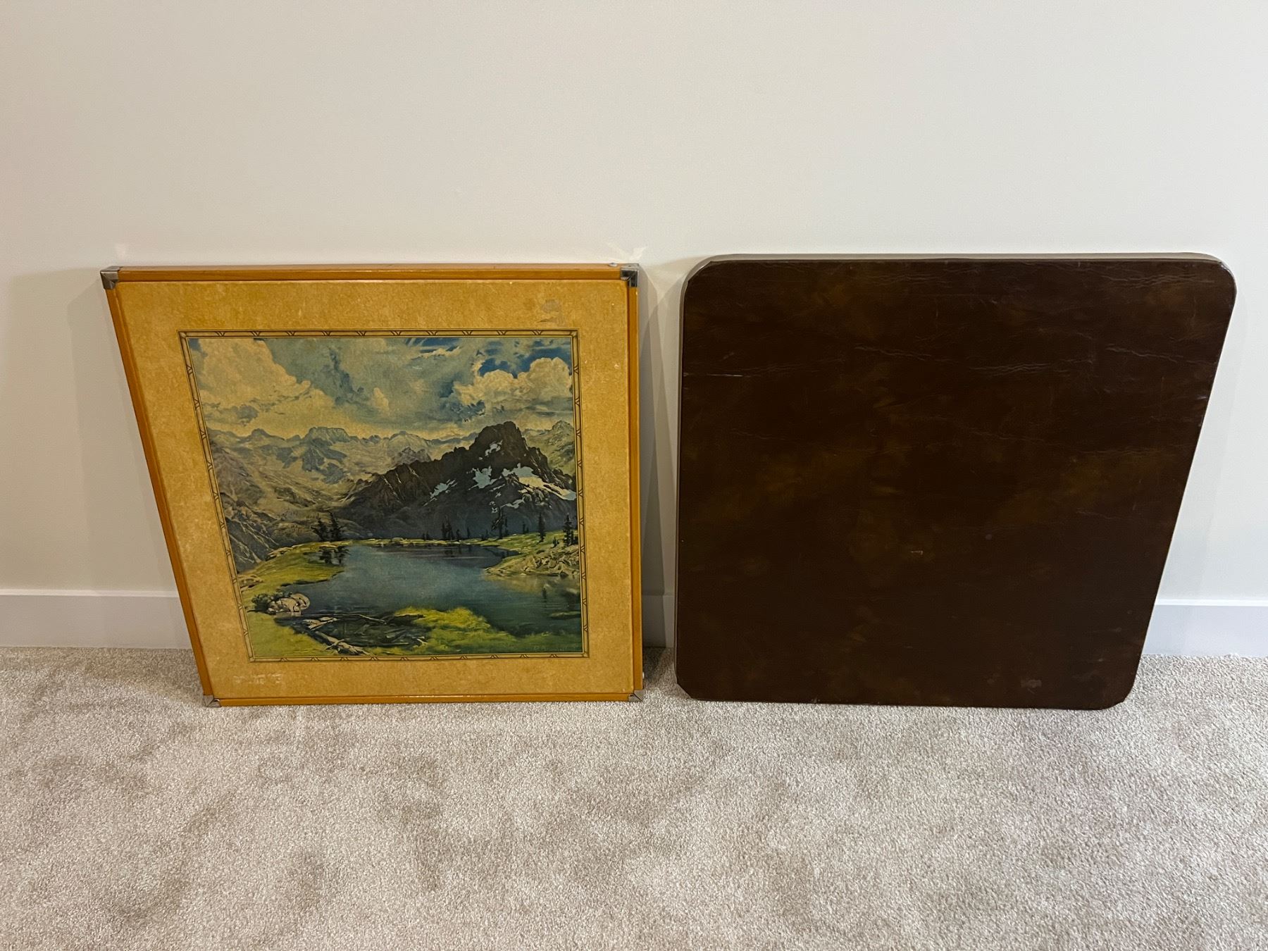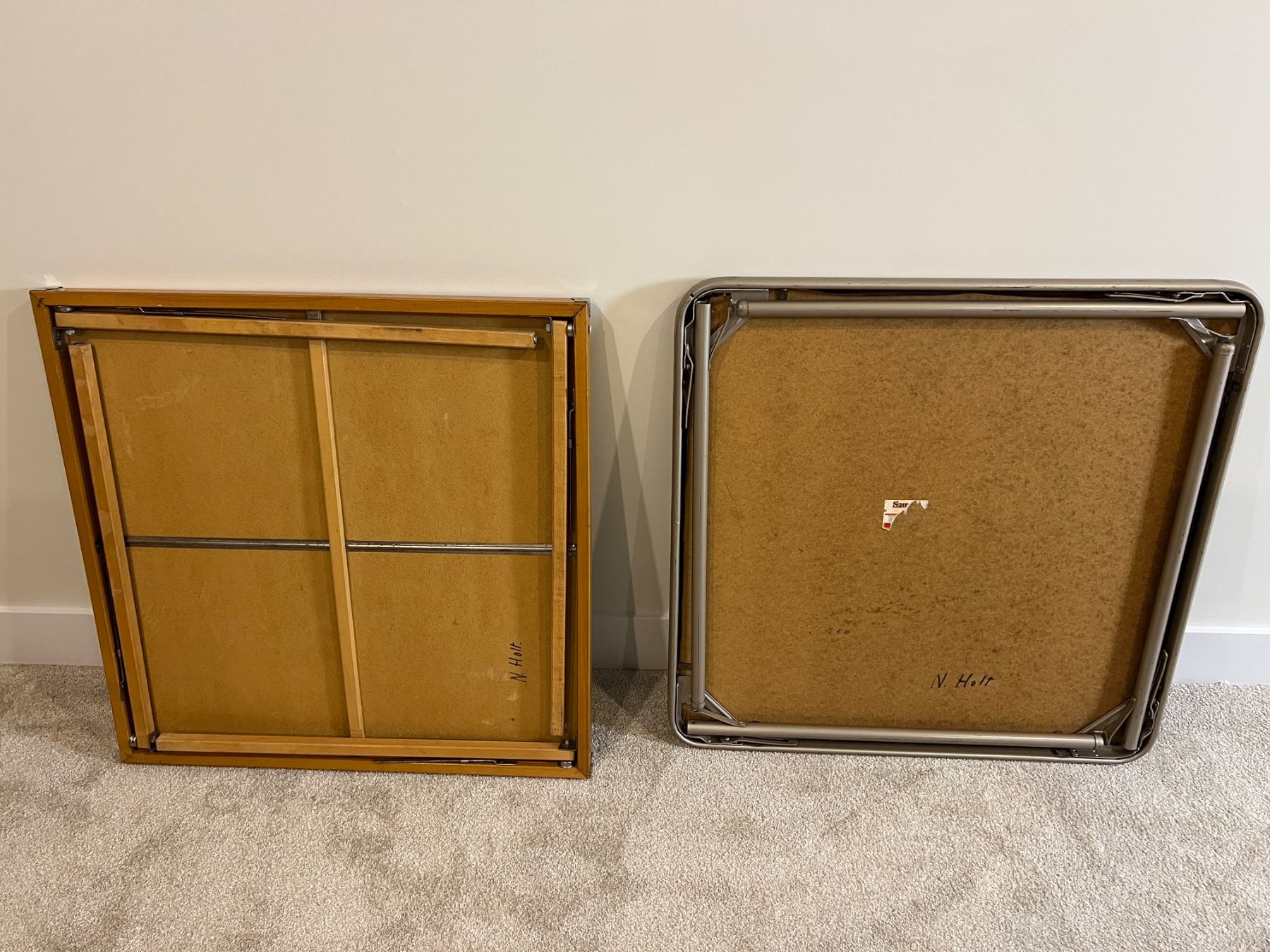 Both have some wear, the table with wooden frame is 30"L x 30"W x 26.5"H