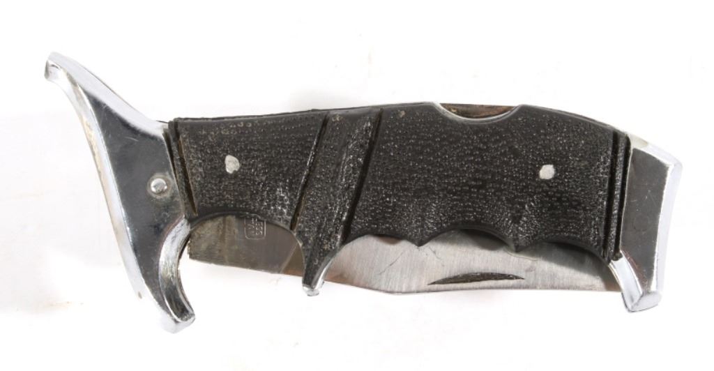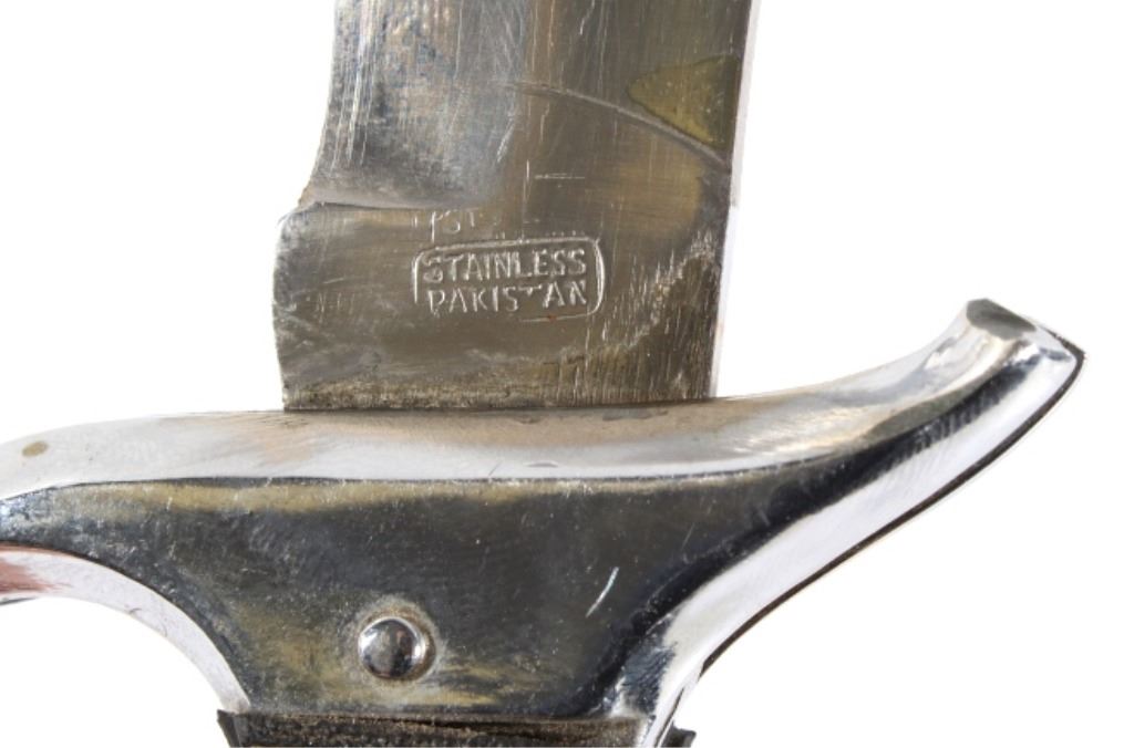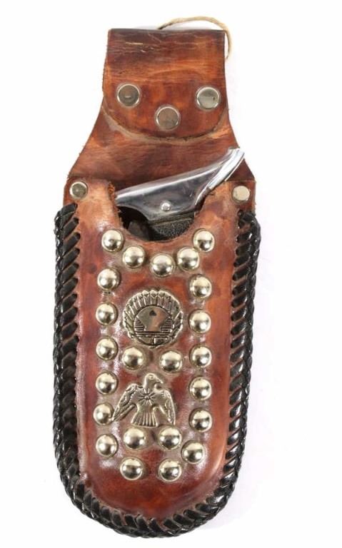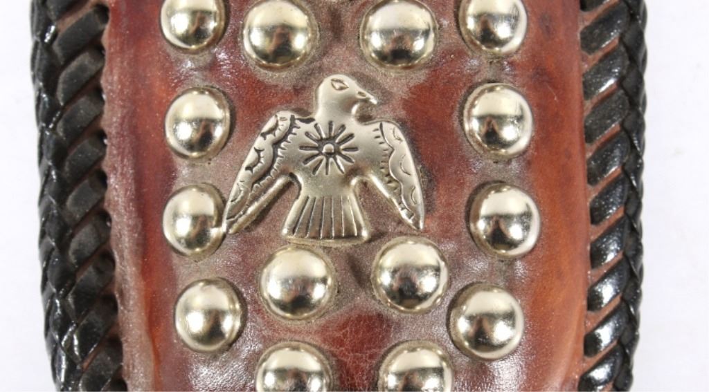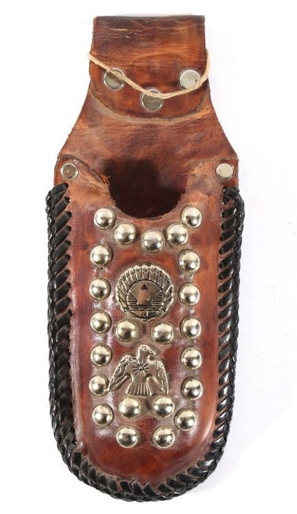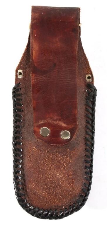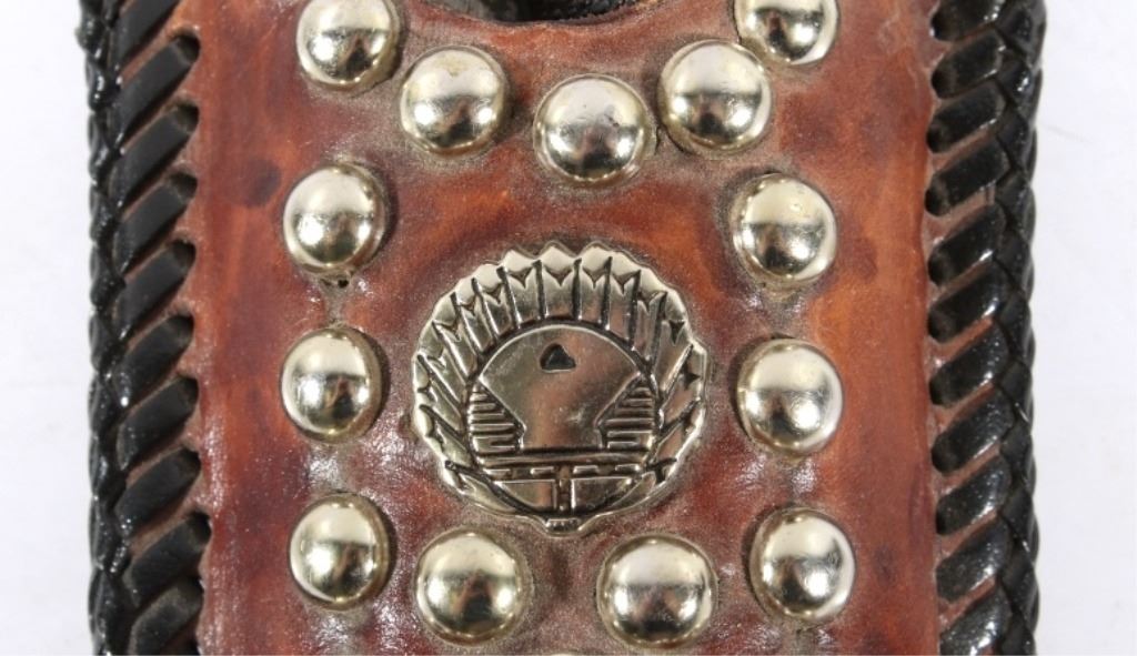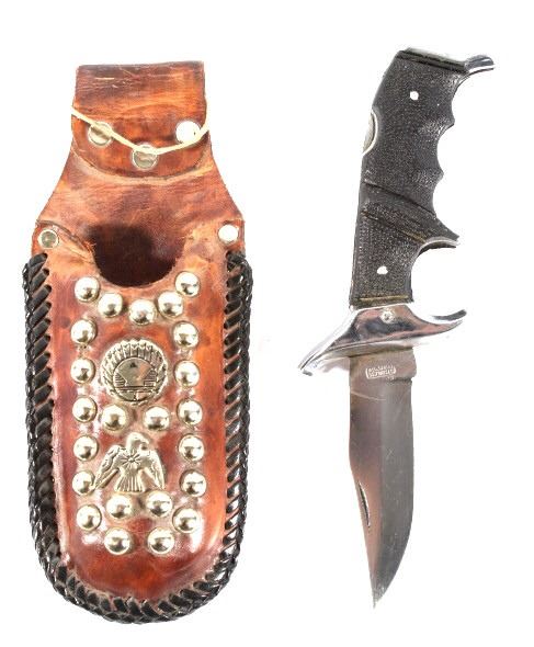 Offered in this lot we have a folding knife with Native American leather sheath. The knife shows stainless steel construction with rubber grips. The blade is marked near the grip reading "Stainless Pakistan". The grip shows steel construction with rubber pads and a steel guard. The sheath is made of leather and is designed to hold the knife while its folded. The sheath features black leather bindings on the sides and is decorated with steel tacks with two Native American pins. The first pin is in the image of a squash blossom and the second is in the image of a thunder bird. The set in in good condition overall with some wear on the knife. The knife measures 8 3/8" long overall with a 3 1/2" folding blade.
