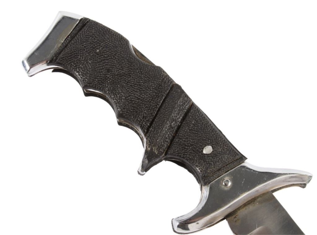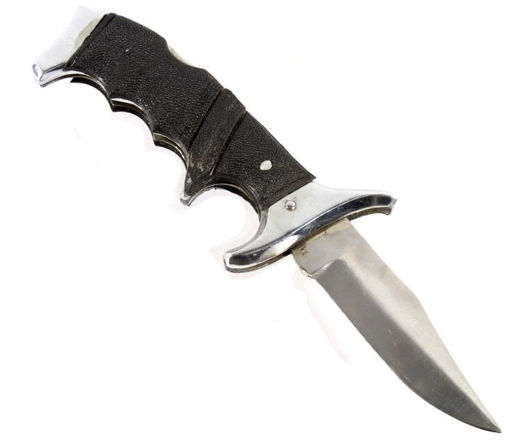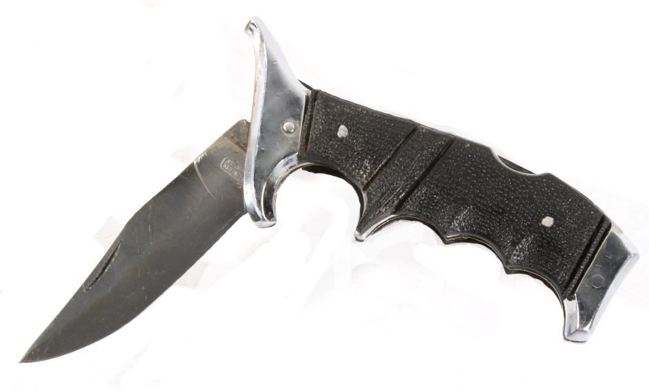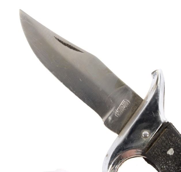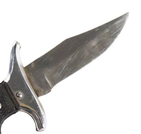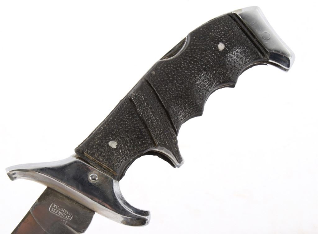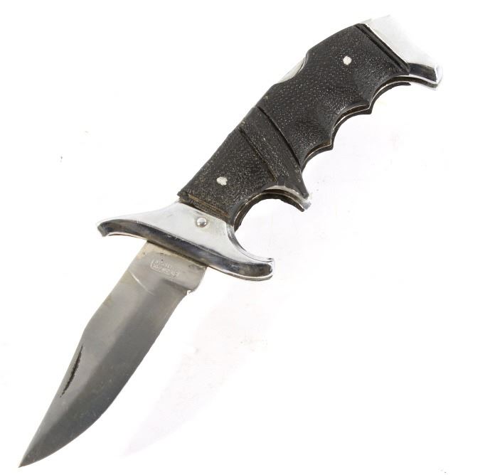 Offered in this lot we have a folding knife with Native American leather sheath. The knife shows stainless steel construction with rubber grips. The blade is marked near the grip reading "Stainless Pakistan". The grip shows steel construction with rubber pads and a steel guard. The sheath is made of leather and is designed to hold the knife while its folded. The sheath features black leather bindings on the sides and is decorated with steel tacks with two Native American pins. The first pin is in the image of a squash blossom and the second is in the image of a thunder bird. The set in in good condition overall with some wear on the knife. The knife measures 8 3/8" long overall with a 3 1/2" folding blade.