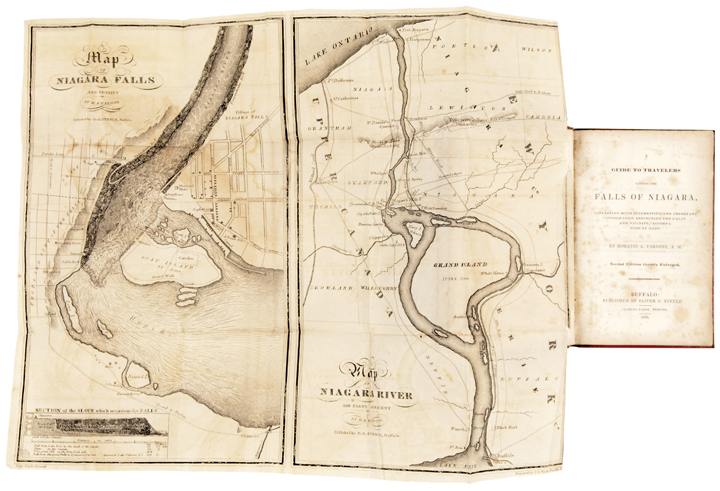 This original period Folding Map and Guide is fully titled, “A Guide to Travelers Visiting the Falls of Niagara, Containing Much Interesting and Important Information Respecting the Falls and Vicinity, Accompanied by Maps”. By Horatio A Parsons. Buffalo, 1835. Published by Oliver G. Steele. "Second Edition Greatly Enlarged". It measures about 3.75" x 5.75" and contains 96 pages, plus a Pair of Maps on a single folding sheet, engraved by J. G. Darly. One map is titled, "Map of Niagara Falls and Vicinity" and the other is titled, "Map of Niagara River and Parts Adjacent". This important, very early Guide to the Falls contains extensive information of interest to the Tourist visiting the Falls. It includes descriptions of the various locations and Natural Formations, Mineral Springs, Local Indians, the Museum, Monuments and man-made Curiosities, the Village of Niagara Falls, the means of reaching the Falls and charges for transportation, distances for the traveler, etc.