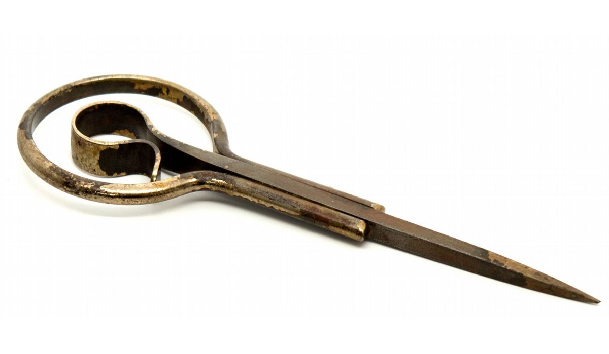 Mechanical (folding) miner's candlestick. 7” folded, 7.25” unfolded. No markings. Thimble, spike, and thumb lever crafted from one continuous piece of metal. No thumb lever. The handle and spike are riveted together with a reciprocating clamp. The spike is plain and square. Appears to have once been plated in brass. - Jacobitz Collection -59776