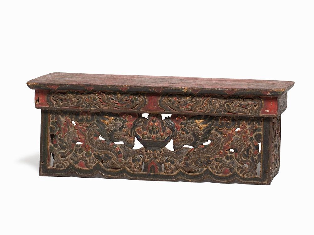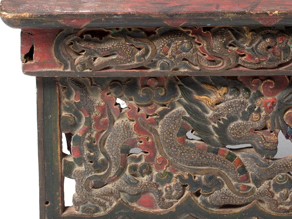 This monk table is made of hand-carved and painted wood and comes from Tibet. There he is called chogtse and has three folding legs. The latter shows open work elements such as dragons and clouds. In the center the desired jewel Cintamani is visible. The ornaments are worked in high relief, which creates an appealing look and at the same time a dynamic effect. The table top is accented in red with other motifs and the inside of the table is untreated.