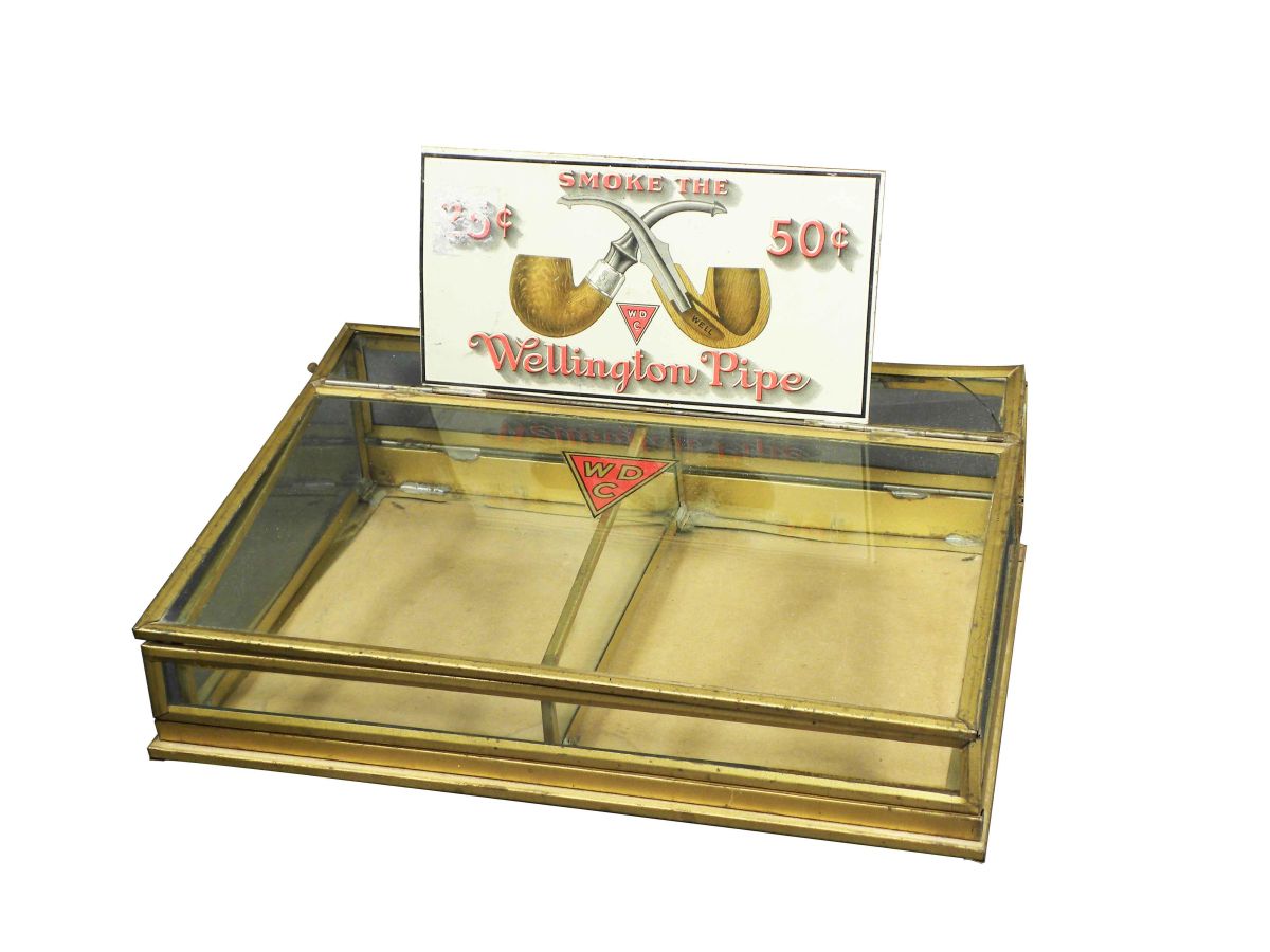Folding Pipe Display for Wellington Pipes. The only one we have ever seen. Glass and tin. Excellent condition. 14 X 7 X 10 inches.