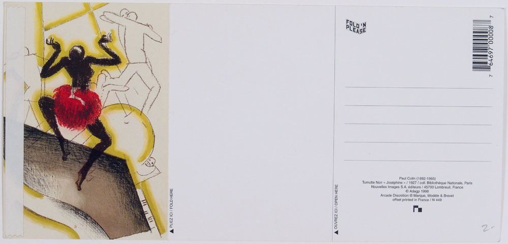 This is a 1998 postcard of Josephine Baker. Original artwork by Paul Colin c1927. Printed in France. SIZE: Approx. 9 1/2" x 4 1/2".