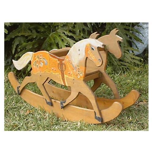 <p>This is a very unusual child's rocking chair horse. The child sits in the seat. It folds up when you want to put it away, store it or travel. Grandmas you can make double use of it when the grand baby leaves, put a big plant in it.<p>The horse measures 28 inches to the tip of the ears, and the length of the rockers are 43 inches .<p> He has a painted white mane and tail, and orange, yellow and brown on his blanket and saddle. The rest is stained.<p>He is a very unique little horse. I love any thing horsey and just thought he was great. He'd make some child very happy for Christmas, or even think of using him as a plant holder.