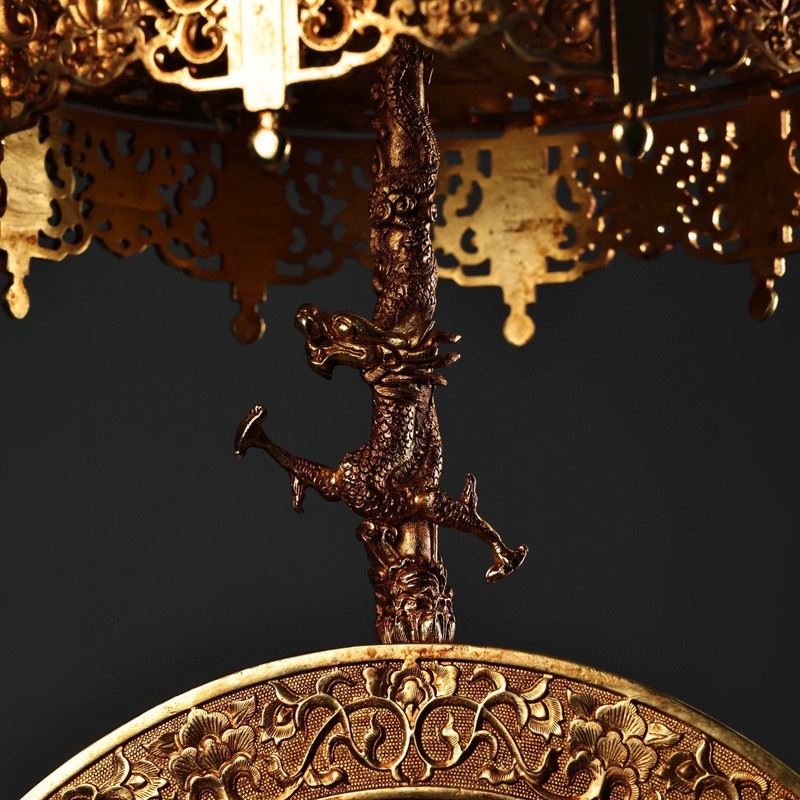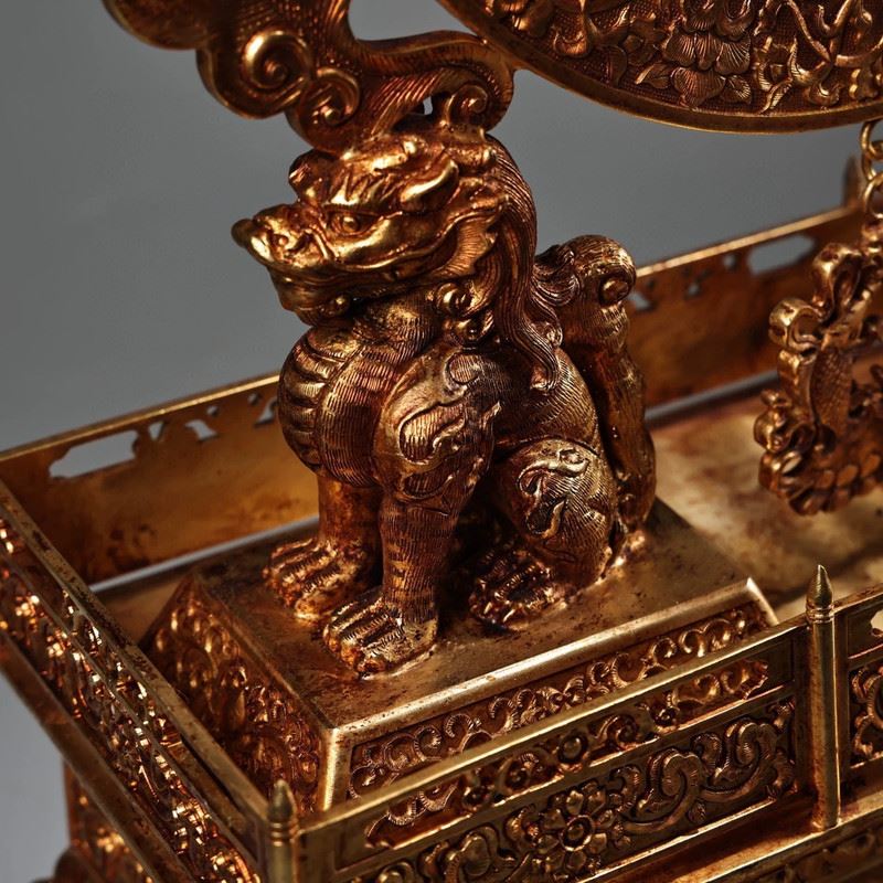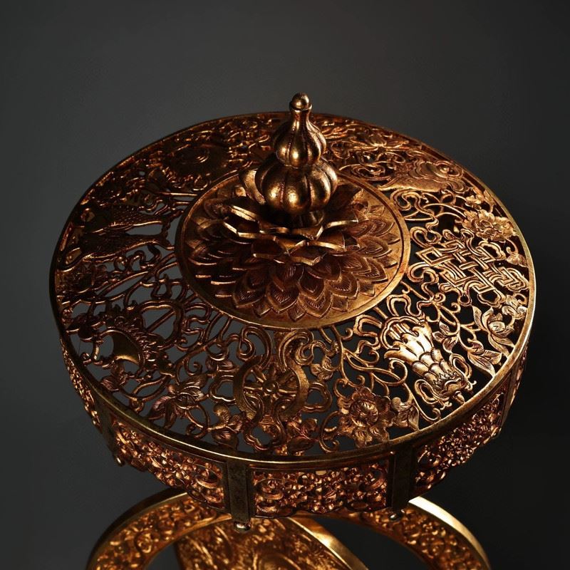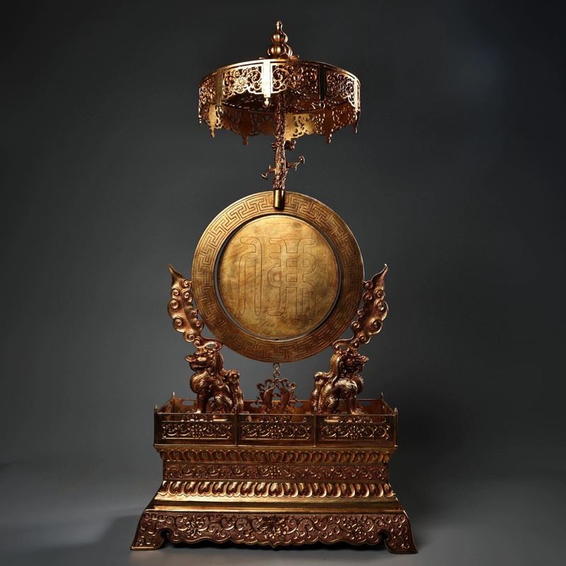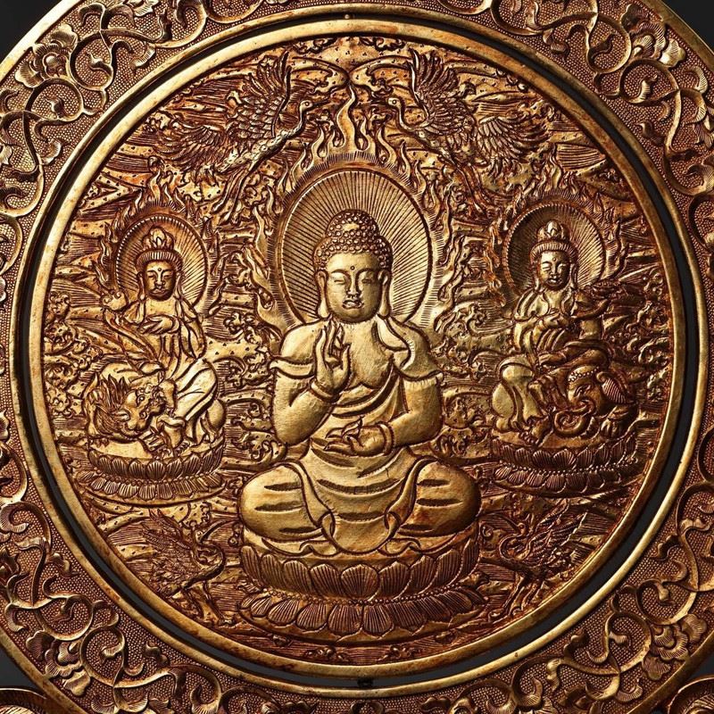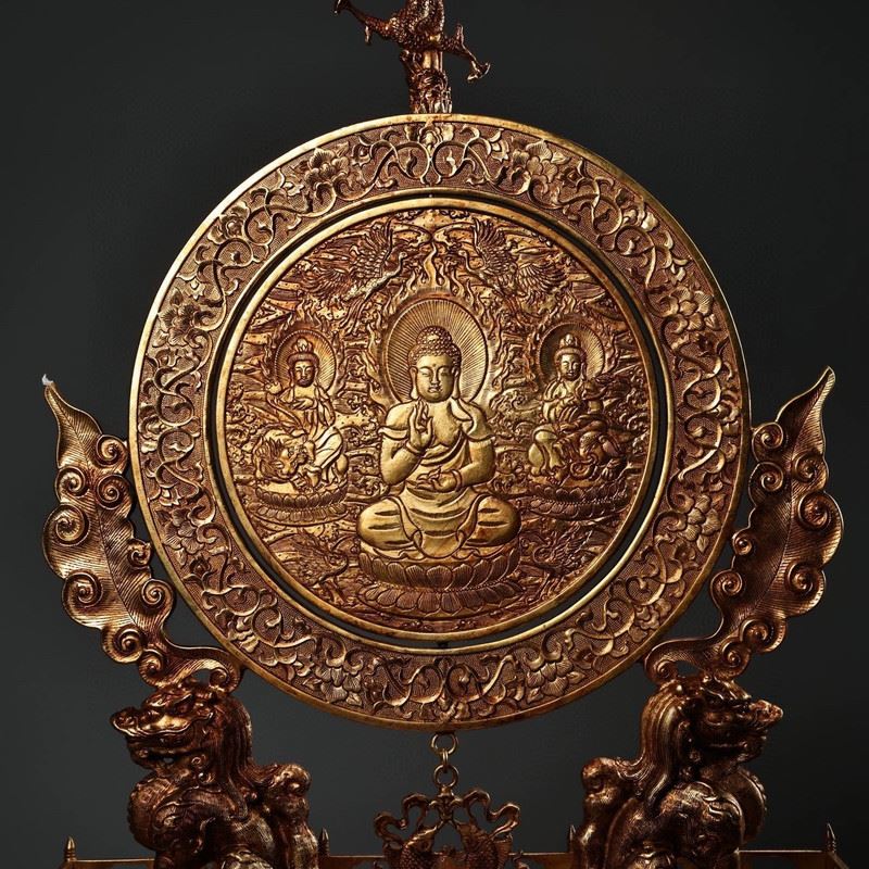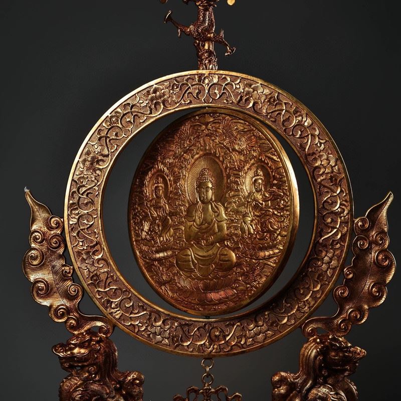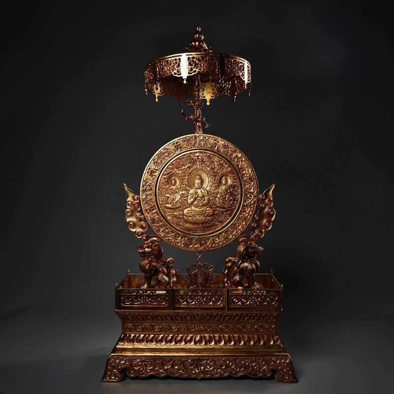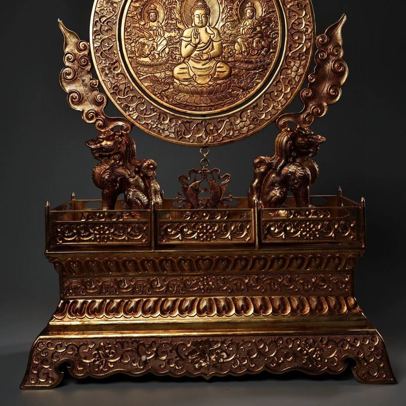 This folding screen Buddha shrine is crafted with intricate bronze sculpture, with a detailed Buddha figure at the center, surrounded by exquisite decorations and carvings. The design of the screen embodies the sacred and elegant nature of traditional Buddhist art, with finely detailed carvings on the base, creating a solemn atmosphere and conveying a profound cultural and religious significance.
