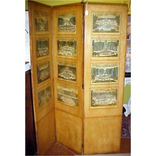 Here we have a great looking folding screen of room divider size that is covered in antique French prints. The ground is a mellow color of ochre, and it looks rich and old, although I am certain it is early-ish 20th century. It is papered in some type of heavy paper on the back, of the same ochre color. It is a 4 panel screen and measures 68" high, and each panel is 18" wide for a total of 72". The condition is good, but not flawless. It has a small slash in the front that is not very noticeable, the edges are frayed, and some of the paper is off the back. However, the flaws and repairs simply add to the character of the screen.