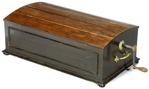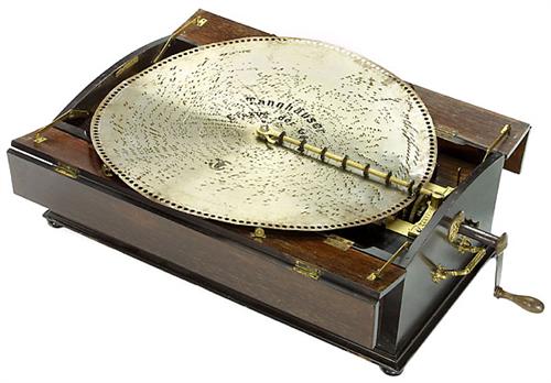"Polyphon Nr. 52 (Folding Top)" für 62,5-cm- Platten, um 1900 Hersteller: "Polyphon Musikwerke, Leipzig", 159-toniger Doppelkamm, komplett bis auf einen Zahn, Federwerkantrieb, Gehäuse mit 2 Tragegriffen, Breite: 73 cm, 4-teiliger Deckel (klappbar). Mit 8 Platten. - Laut "Encyclopedia", S. 158, sind nur einige wenige Exemplare dieser Größe gebaut worden! - Hervorragender Zustand, mit exzellentem Klang!