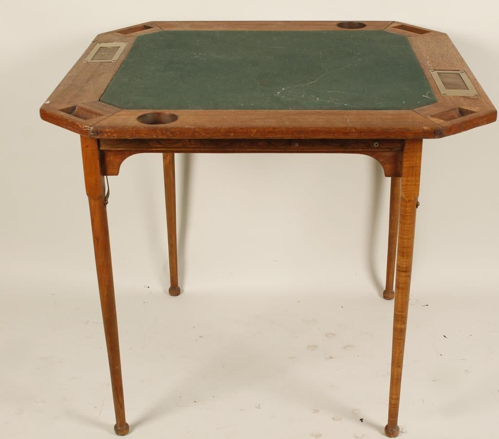 Green fabric topped square table with angled corners measuring 32" across. Has Semi-circular cut depressions for holding chips, holes cut to hold drinks and two spring loaded holders for paper tape which feeds up through the top surface into a leather writing area for score-keeping.