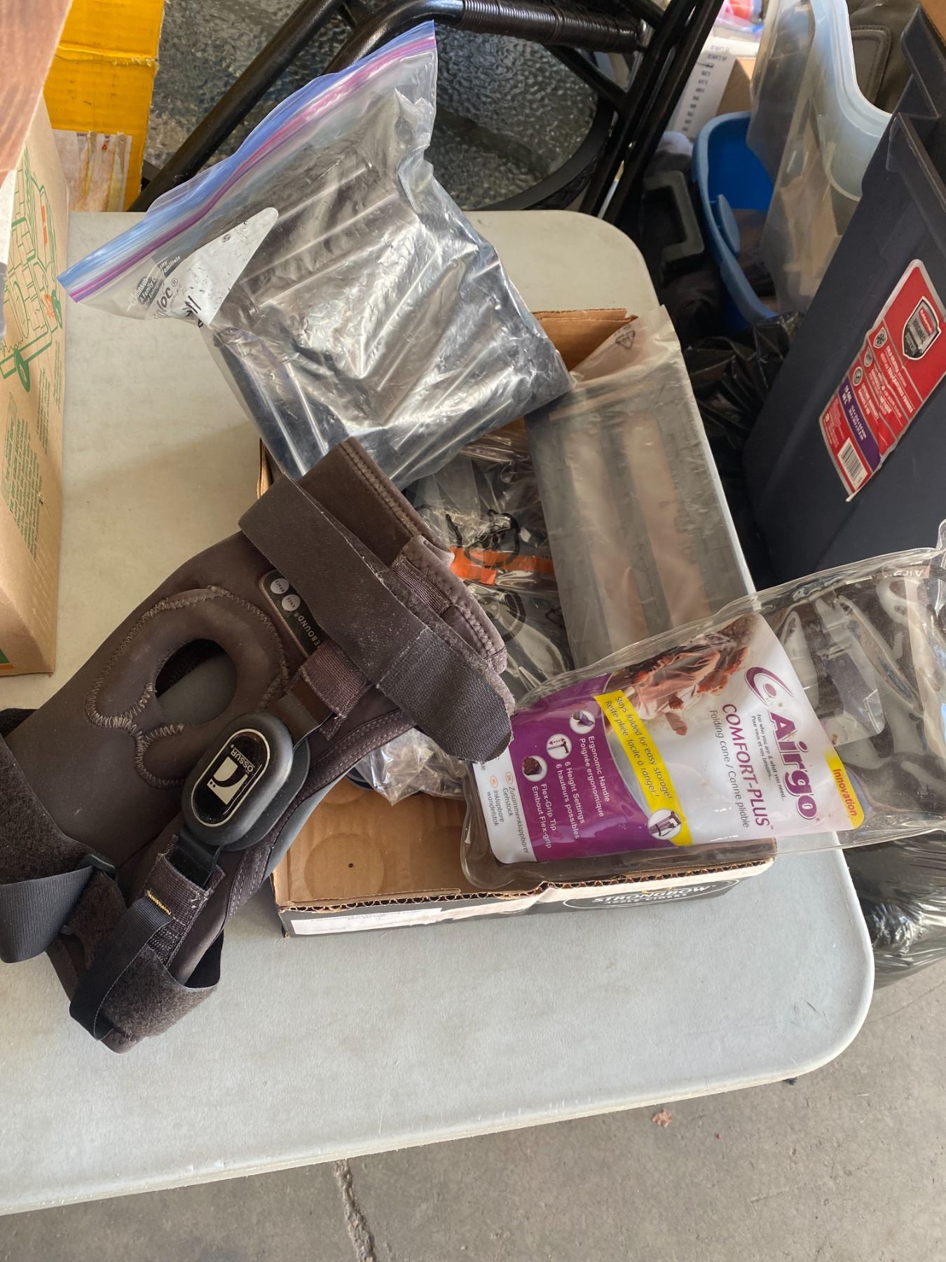 Folding cane, knee item and other
