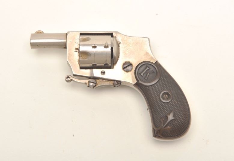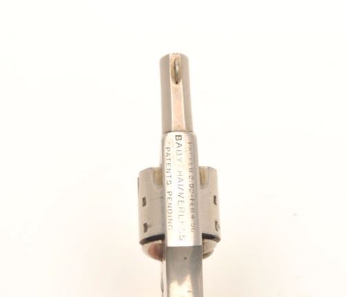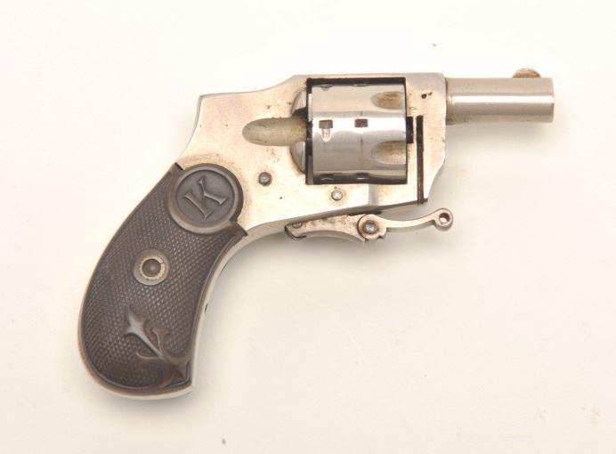 Folding trigger Baby Hammerless revolver, .22 caliber, 1.25” barrel, nickel finish, checkered hard rubber grips, no visible S/N, in overall fair to good condition showing the majority of its original frosted nickelfinish, good markings and grips; action needs work and the cylinder pin is missing. (C&R/PPT). Est.: $100-$200.