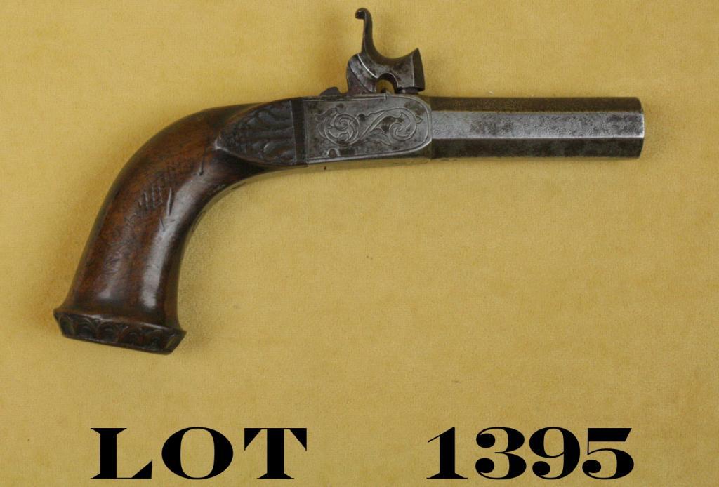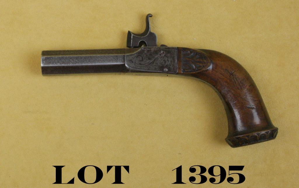 Folding trigger single shot percussion muff pistol, .50 cal., 2-1/2” octagon barrel with Damascus design on barrel, raised carved wood grip, #43. This diminutive gun is in overall good condition showing an even gray patinawith engraved frame, fair bore, good action, worn but good grips with some scattered mars and scratches. Est.: $150-$300.