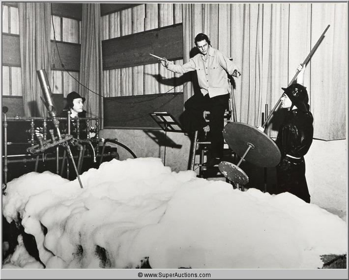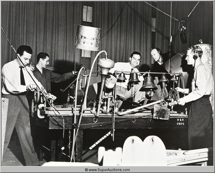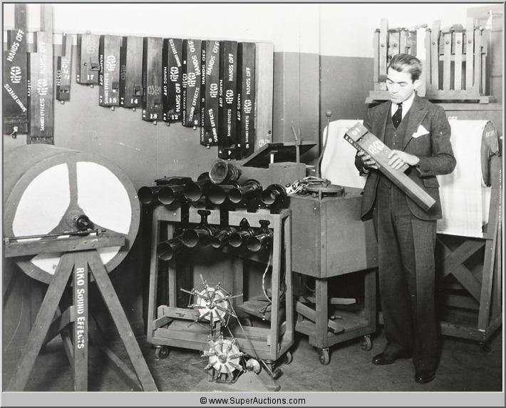(12) Pictures mounted on poster board depicting various equipment and uses for creating sounds in films / L20" x H 24" up to L 40 3/8" x H 20"