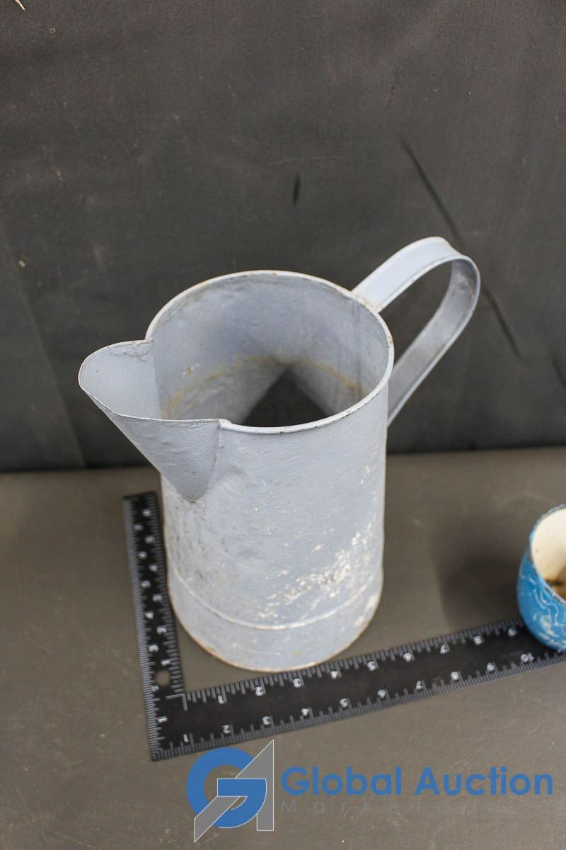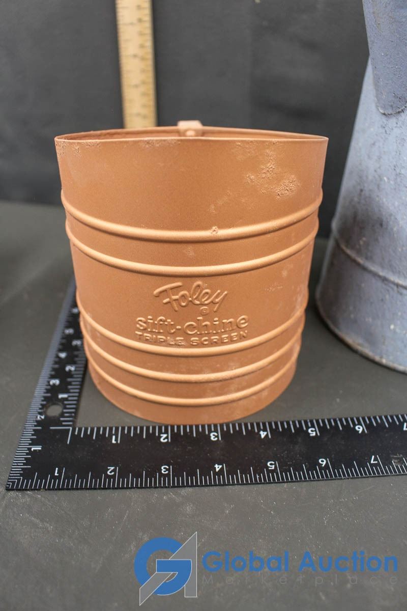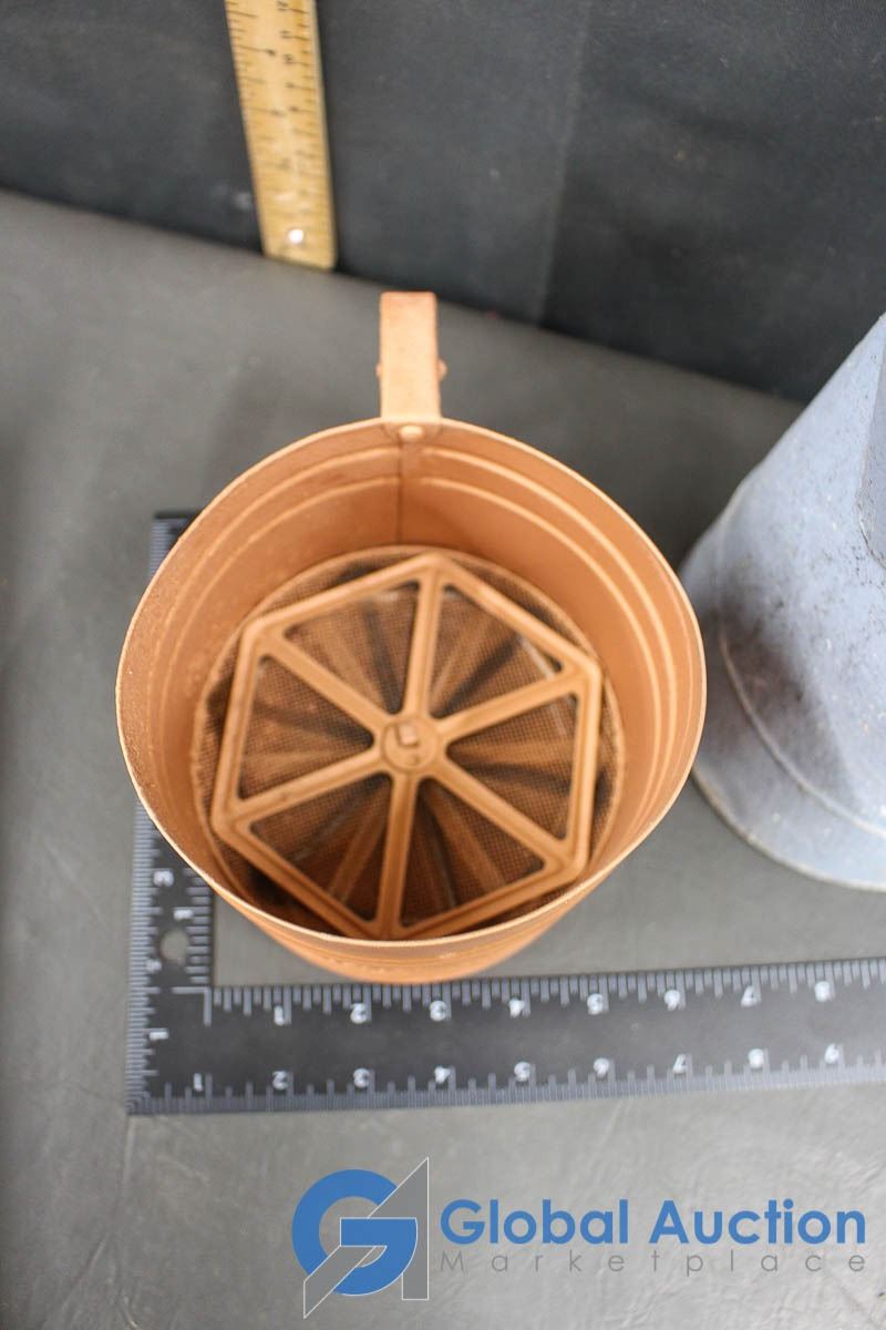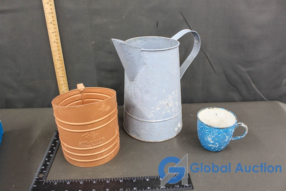 Foley Triple Screen Sifter; Enamel Cup & Metal Pitcher