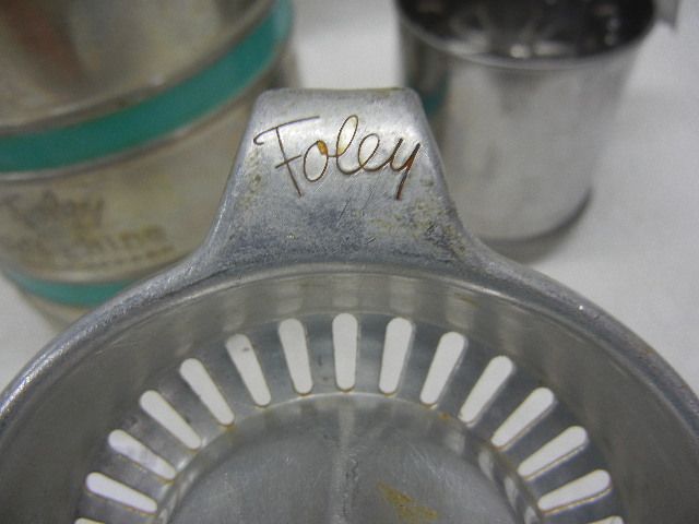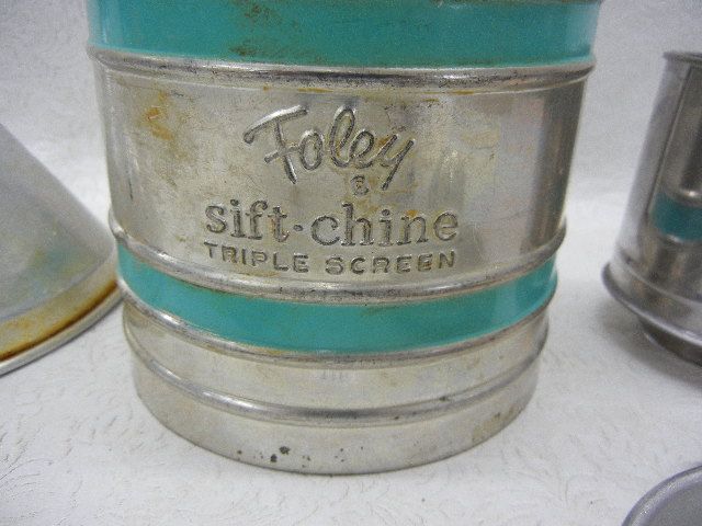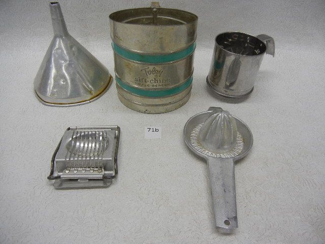 Foley Triple Screen Sifter, Foley Juicer, Egg Slicer, Funnel, and Small Sifter