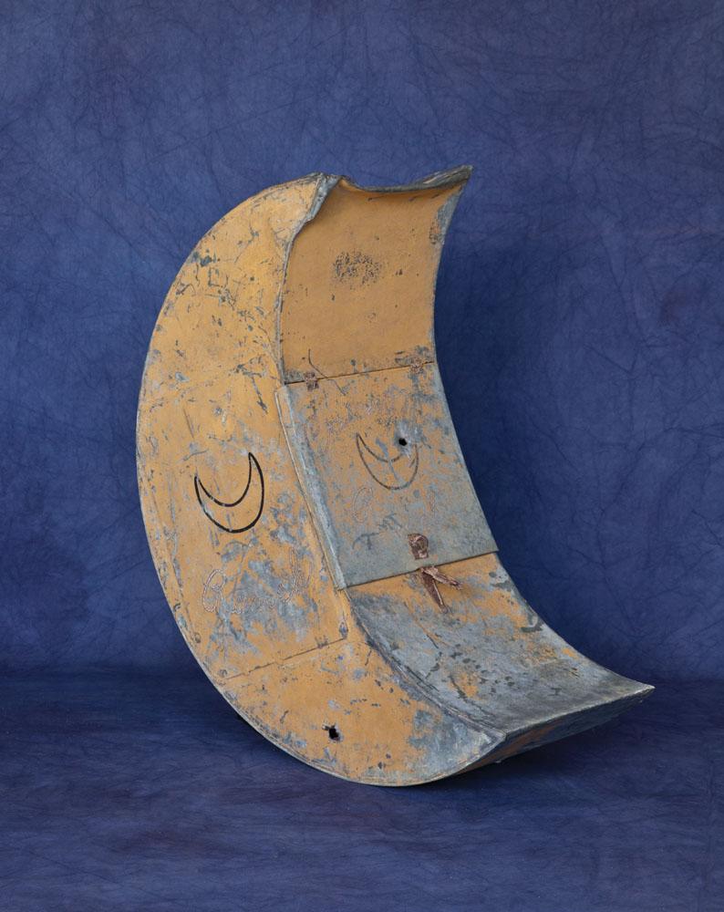 From the famous Cody, Wyoming Crescent Moon Ranch on the North Fork of the Shoshone River. This folk art mailbox in the shape of the crescent moon was a landmark for travelers on their way to Yellowstone Park for years. The owner of the ranch was nationally renowned cowgirl Lucylle Moon Hall, a Wild West performer, community leader and inductee into the Cowboy Hall of Fame. The moon is made of galvanized metal and retains much of the original paint, lettering of Crescent (moon) Ranch, 34” tall and 15” deep by 14” wide. The ranch was also known over time as the Moon Crest Ranch, c. 1930s.