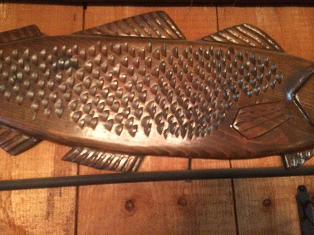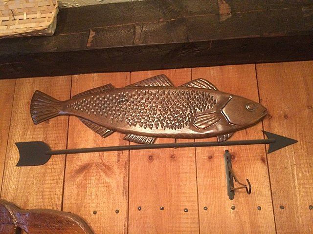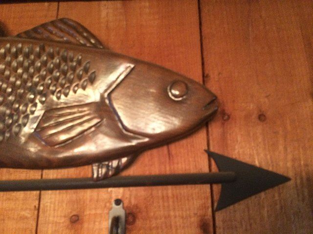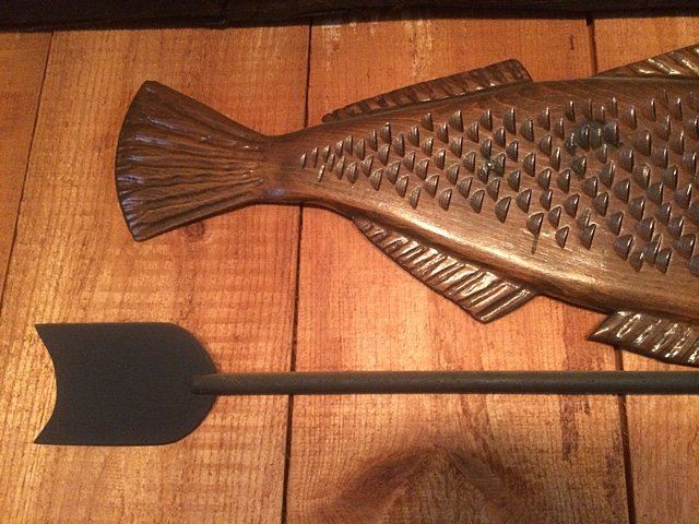Beautifully hand carved Folk Art fish weathervane top. Carved in wood with directional. Very nice decorative piece!