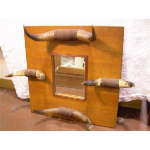 Up for sale is a Folk Art Oak Framed Mirror with horns. It came from a Western Nebraska Ranch and was probably made around the 1940's. Condition is good, but this was a well used item by the ranch hands. There are a few worn spots on the fabric covering the middle part of the horns. The finish on the wood has a few blemishes as well. The frame measures 24" by 24". If you have any other questions, please email us. Thanks for looking!