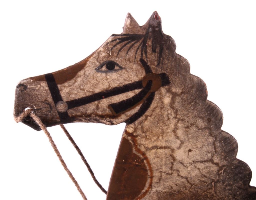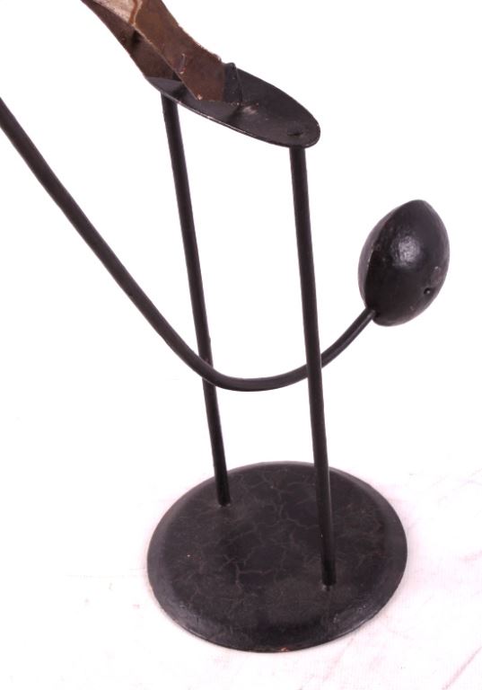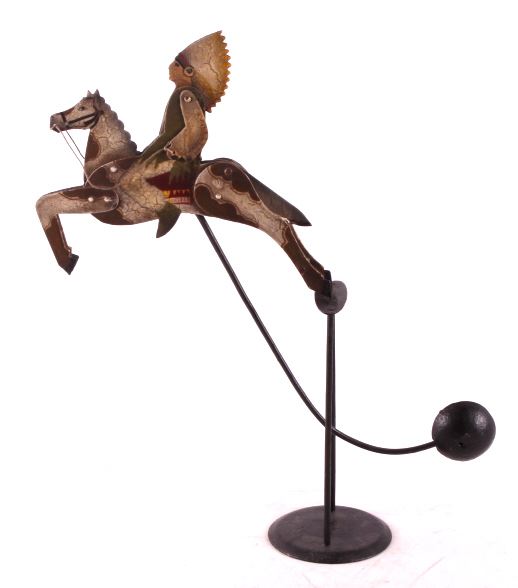 This lot features a folk art galloping Indian moving sculpture. The sculpture is unique in that when the weight on the bottom is pushed the Indian and horse appear to move as if they were in full gallop. The piece is made of metal and shows all hand painted attributes on both the horse and Indian. When still the piece measures 19.75" tall.