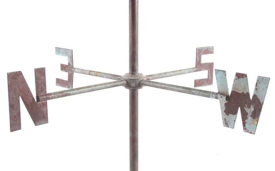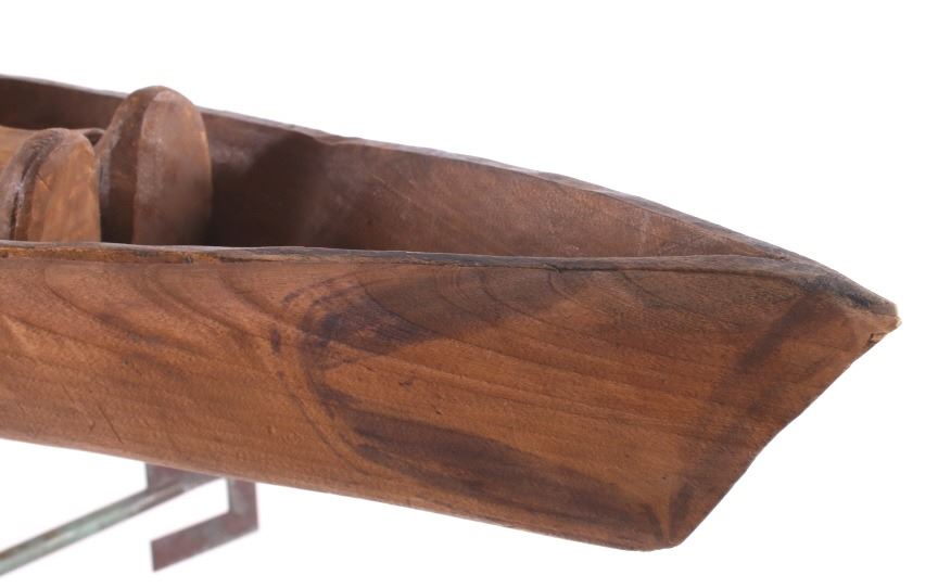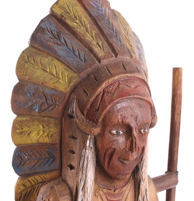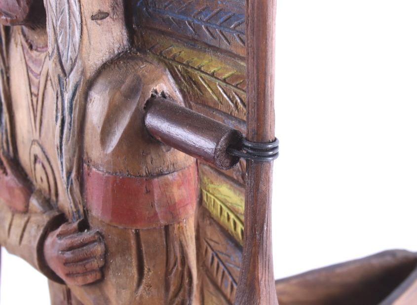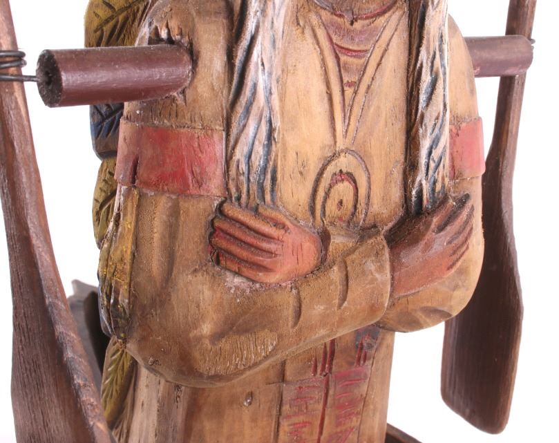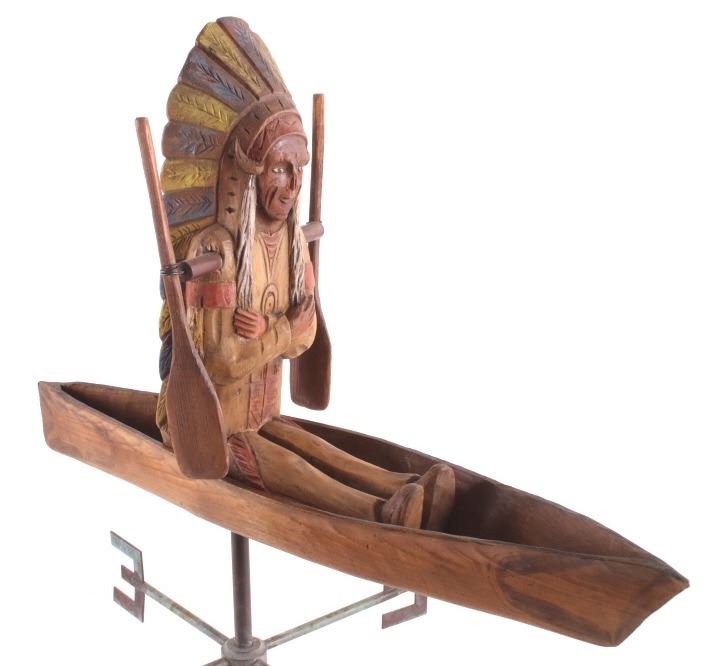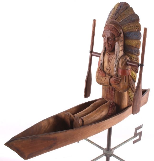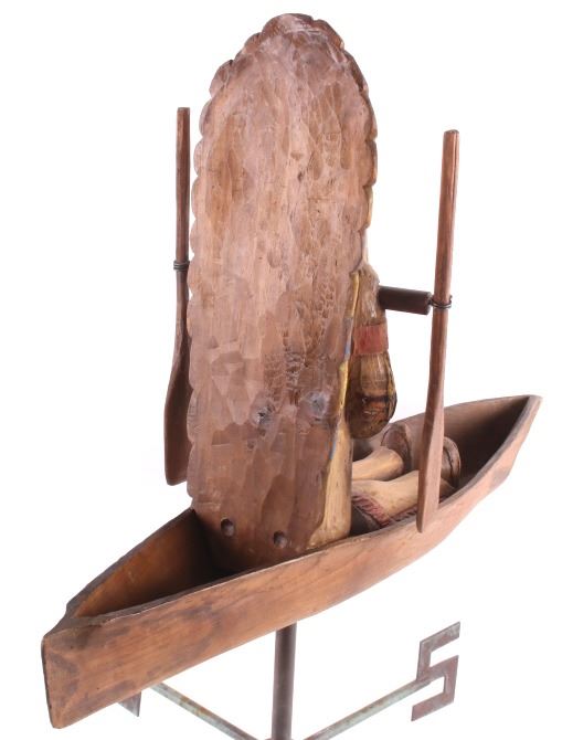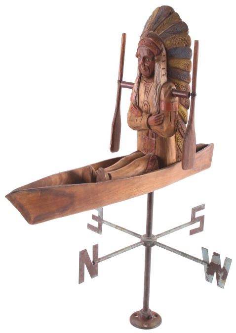 Made available in this lot for your consideration is a hand carved, folk art Native American Indian chief whirly-gig weather vane with a wonderful age. The chief is sitting contently in his kayak, with arms crossed. The Chief and his kayak sit atop a directional base. The chief is adorned in traditional Native American garb, including full head dress, and war shirt. The whirly-gig originates from the early to mid 1900's, and shows good condition overall. When placed on his stand, the set measures 24 3/4" tall, 20 1/2" long, and 14 3/4" deep.