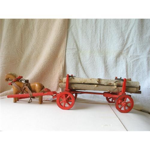 Folk art model of a logging wagon that recalls the long gone days of the 19th century when most of the heavy work was done by horses.Model is of a horse harnessed to a wagon pulling a heavy load.Wagon painted red with fully functional wheels and parts