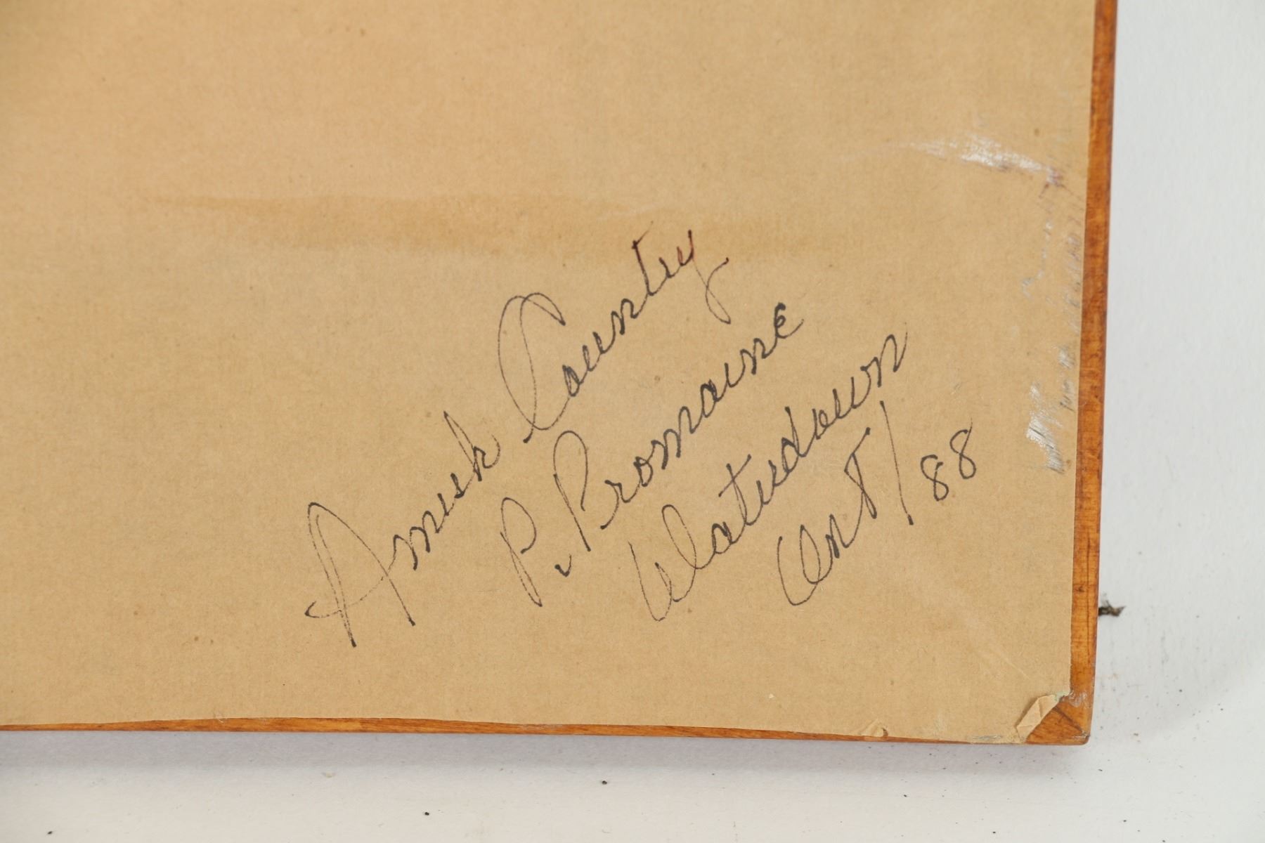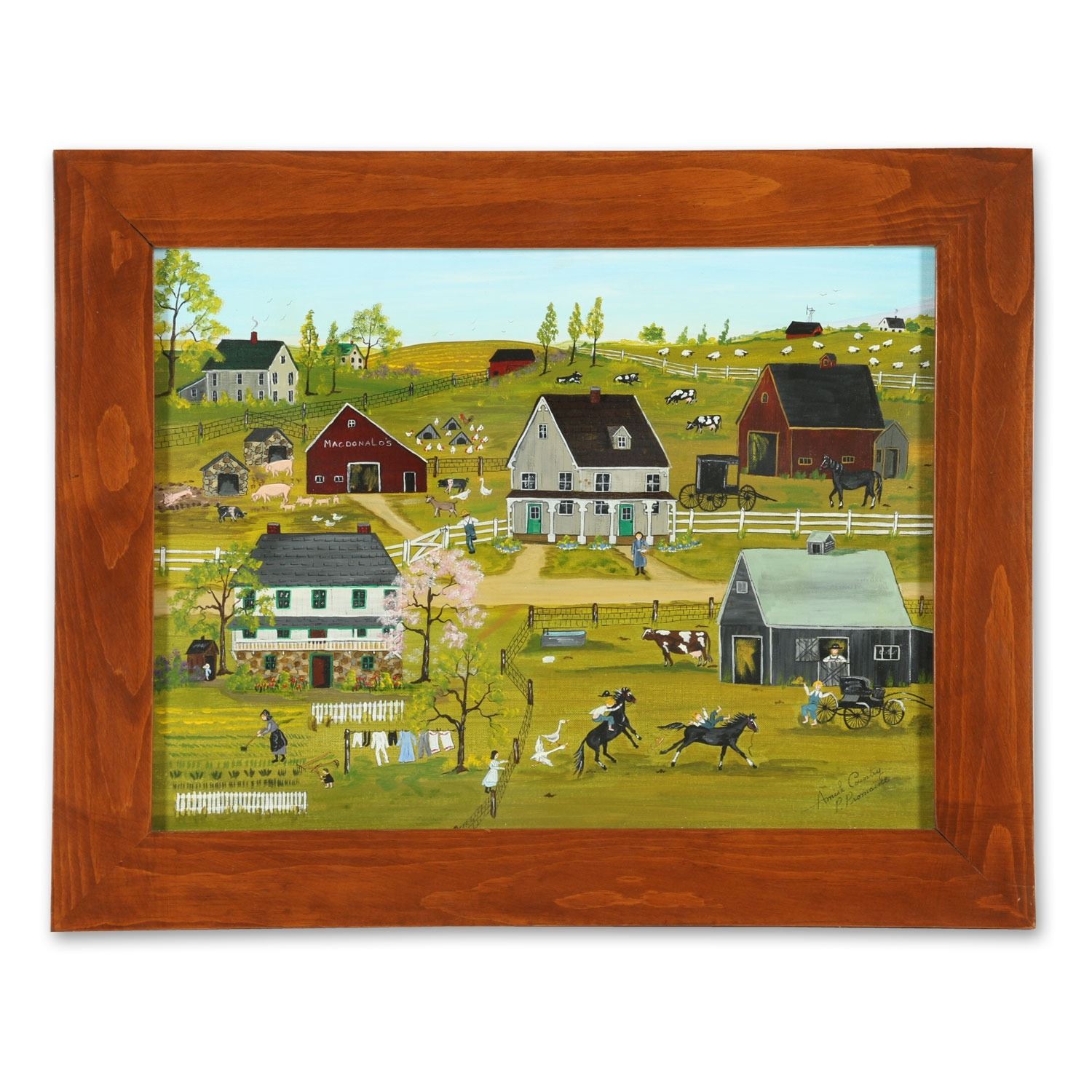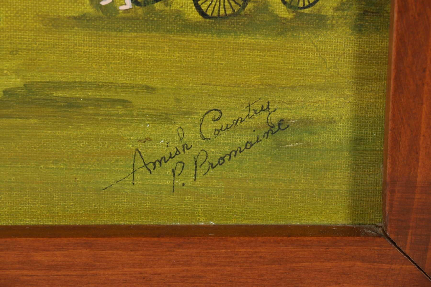 Signed 'P. Promaine' for Patricia (1918-2012), Waterdown, Ontario, titled 'Amish Country, dated 1988, on canvas board, one farm building named 'MacDonald's,' sight 17.5 x 23.25". Condition: Excellent