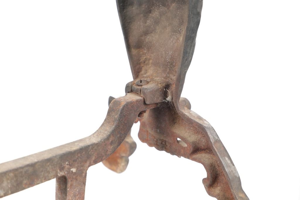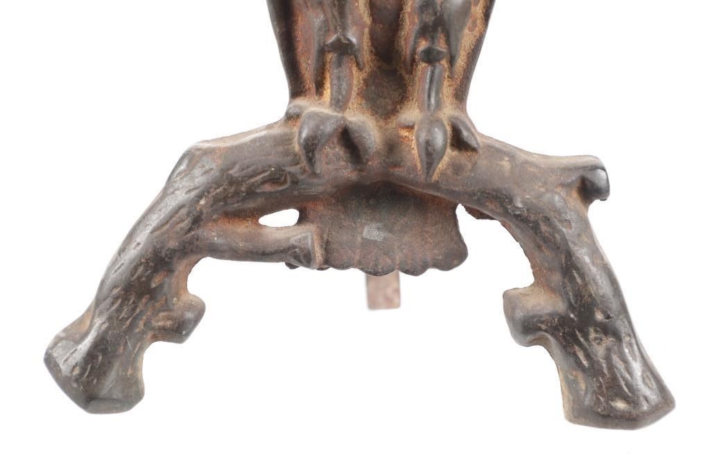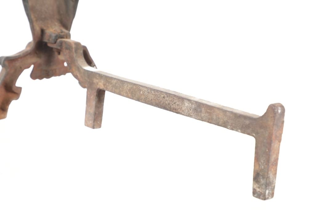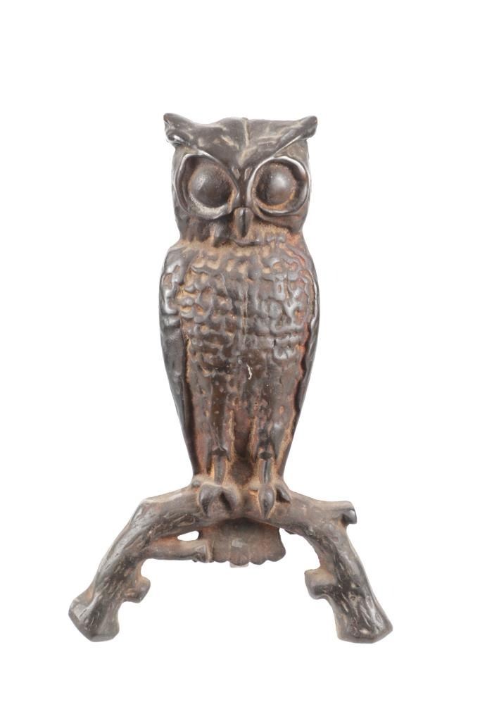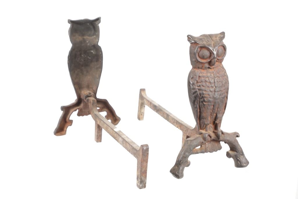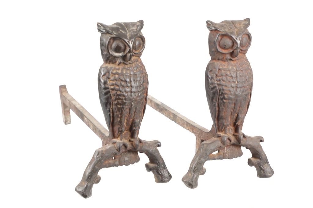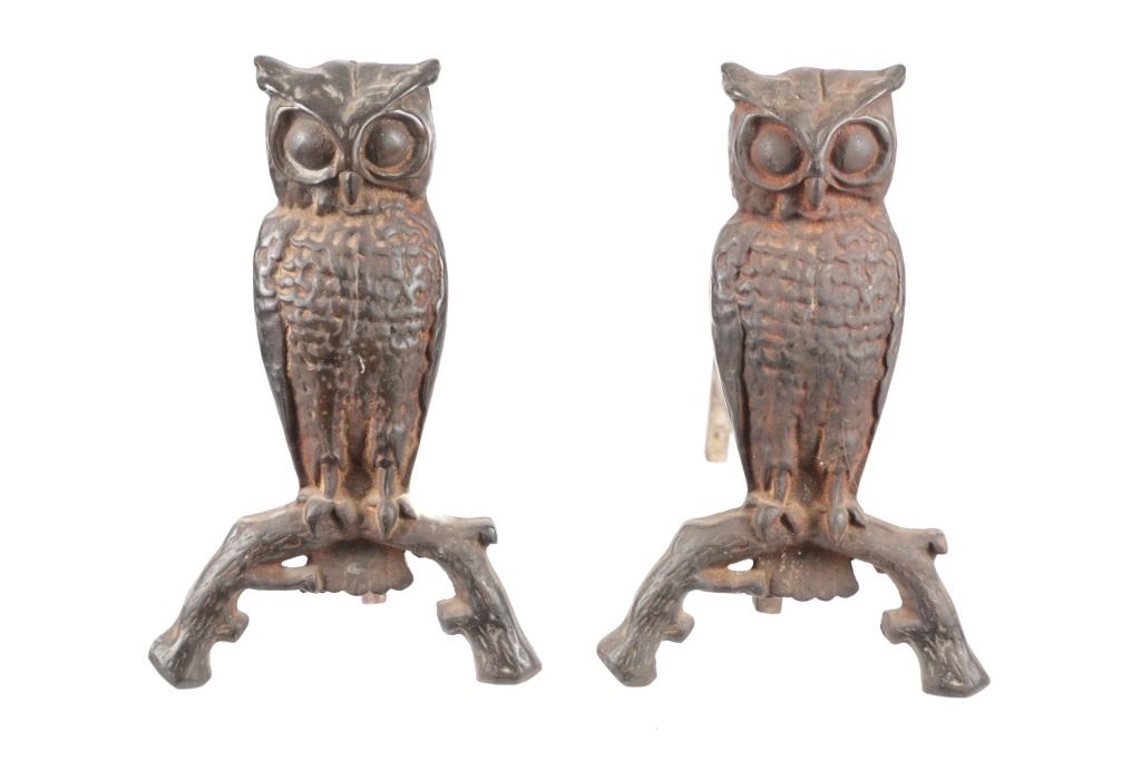Featured in this lot is a folk art owl cast iron rod andirons, circa 1950s. The andirons feature a wonderfully and professionally crafted cast iron construction that shows welded square rod frames with owl figures added to the face of the andirons in a perched position. The andiron is marked on the back of the face '144'. The condition of this pair of andirons is good with some soot stains from use and oxidation and patina due to age and use, but otherwise they show good overall condition. The measurements of this pair of andirons are 13" x 8" x 16 1/2". The collective weight of these andirons is 11lb 14oz.*