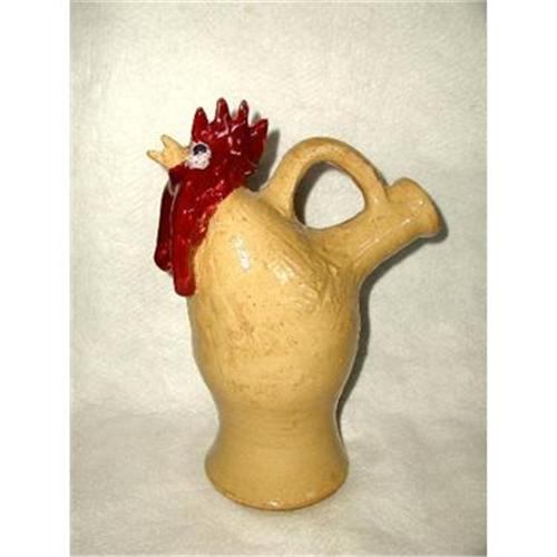 Delightful pottery yellow ochre and brick red rooster pitcher is signed on the bottom by well known folk potter,Jerry Brown of Hamilton,Alabama.The deep blue eyes have a whimsical expression. The 64 ounce pitcher is glazed on the inside and ready for any type of hot or cold liquid. Mr. Brown comes from 9 generations of folk potters,digs his own clay,processes with mule powered pug mill and fires in a ground hog kiln. He specializes in face jugs prized by today's collectors and has been awarded the Alabama Folk Heritage Award and National Endowment Heritage Fellowship Award for the traditionally and excellence of his craft. Jug in excellent condition, no nicks,chips,cracks and measures 13.5H X 9.5L X 5.5W.