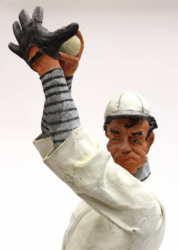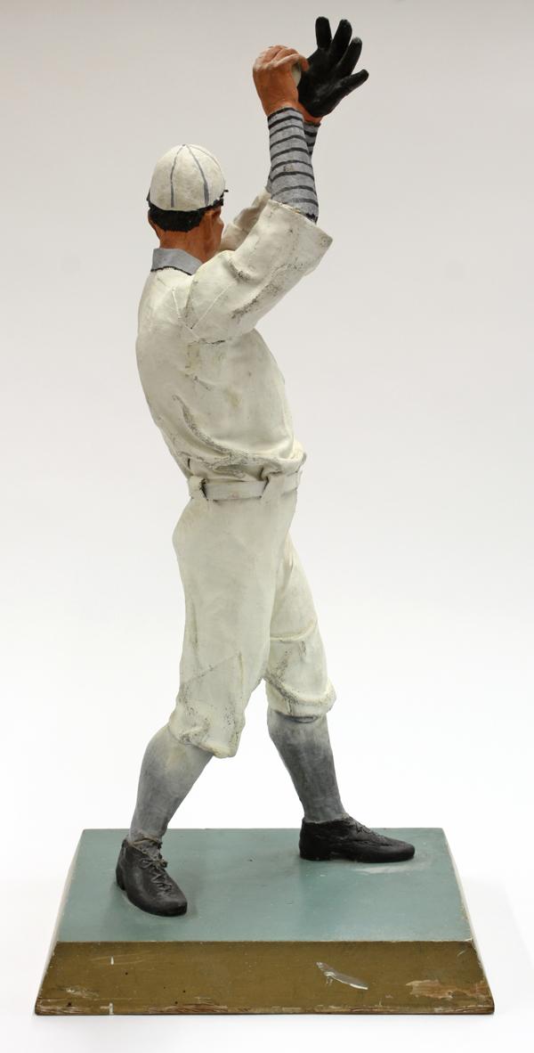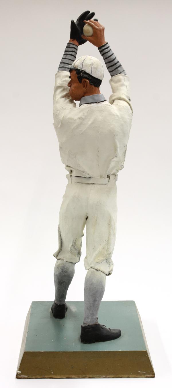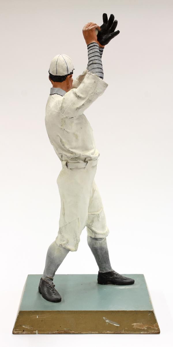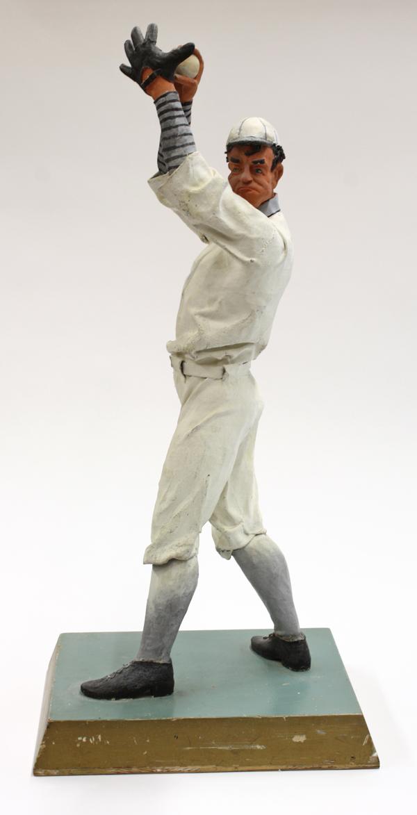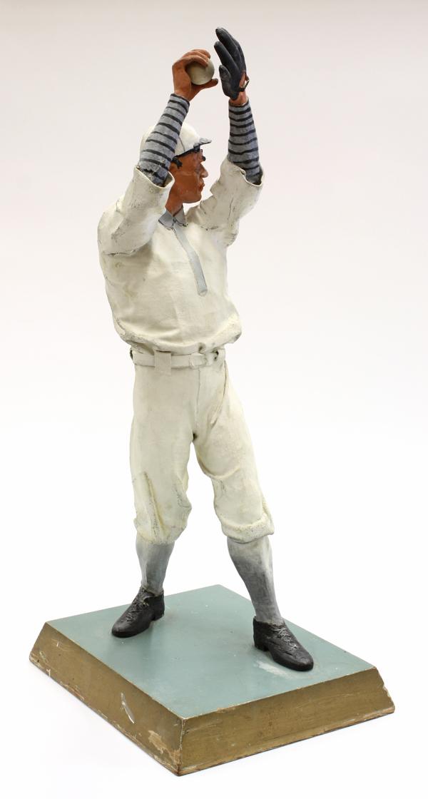 Folk Art baseball player sculpture circa 1930, executed in cloth and Plaster of Paris, the polychrome decorated figure depicted as a pitcher gazing at his target, rising on a partial gilt wood plinth, 30''h