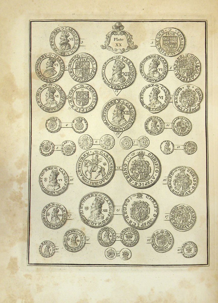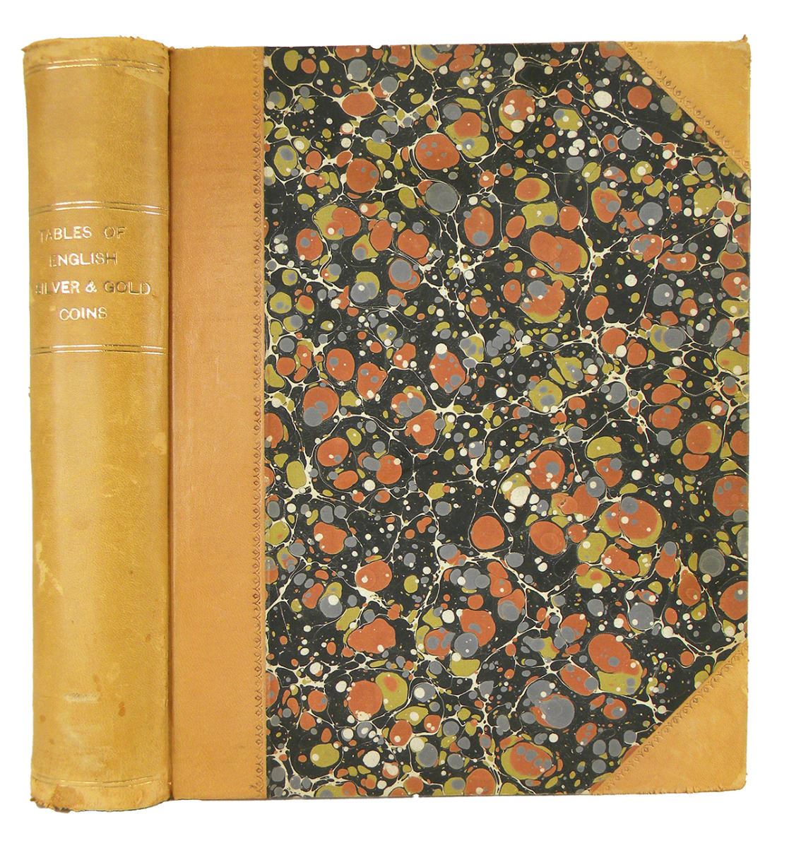 Folkes, Martin. TABLES OF ENGLISH SILVER AND GOLD COINS: FIRST PUBLISHED BY MARTIN FOLKES, ESQ; AND NOW RE-PRINTED, WITH PLATES AND EXPLANATIONS. London: Society of Antiquaries, 1761-63. 4to, later tan half calf with marbled sides; spine ruled and lettered in gilt; marbled endpapers. iv, 161, (1), 119, (1), 12, (121)-216 pages; 42 + 19 + 6 engraved plates, mostly by Francis Perry, of English coins. Some foxing and spotting, as usual; binding a bit rubbed. Very good or better. See catalogue for full description.