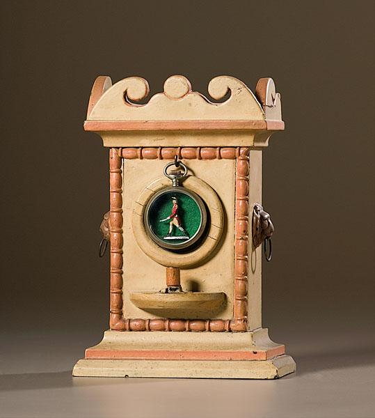 American, ca 1900. A painted wood, folky watch hutch in colors of salmon and cream, with remnants of electrified light socket. Also with a pocket watch case containing a metal toy British soldier; 9.5" high x 6.5" wide x 3.5" deep.