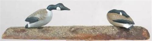 Folky pair of miniature geese by Alston "Shorty" Burr, Hingham, MA. One sleeper and one standing, mounted on a half round branch. XOC. (decoy)