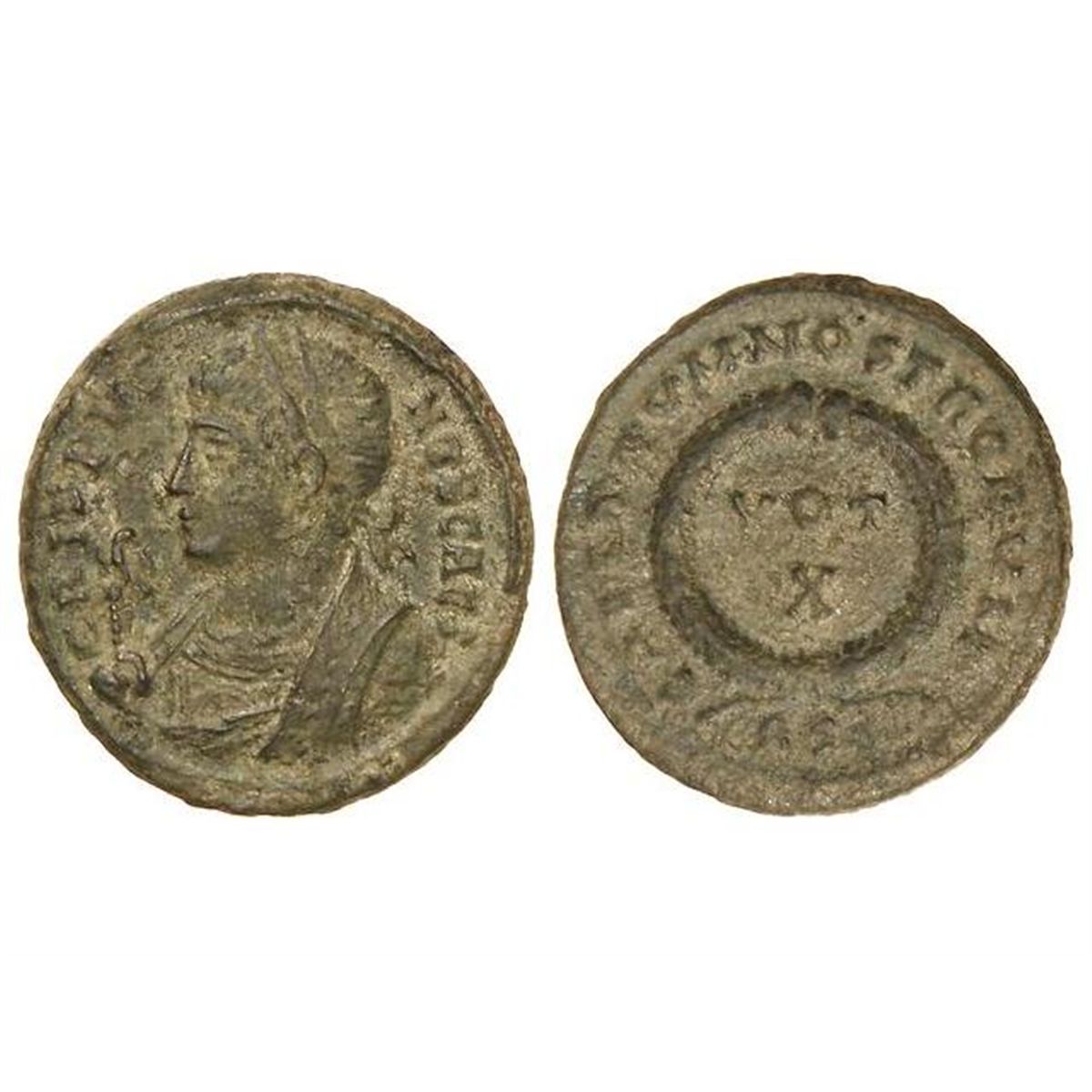 Follis 19 mm. - Acuñada el 321 d.C. - CRISPO. - Rev.: CAESARVM NOSTRORVM. En exergo: RS. Corona de laurel con la inscripción VOT/X. C-42 var. busto a izquierda. MBC. - -