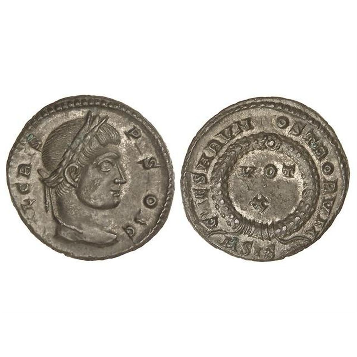 Follis 19 mm. - Acuñada el 323-324 d.c. - CRISPO. - Rev.: CAESARVM NOSTRORVM. En exergo: ASIS VOT.X dentro de corona de laurel. (Restos plateado original). C-44. EBC. - -