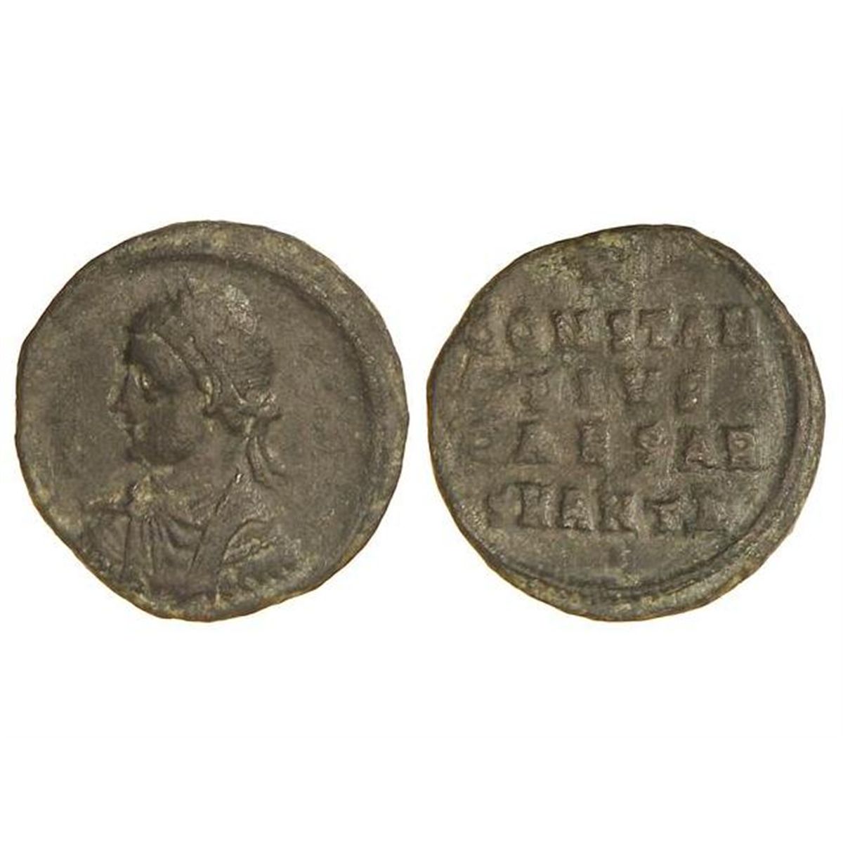 Follis 19 mm. - Acuñada el 324-325 d.C. - CONSTANCIO II. - Anv.: Busto laureado a izquierda. Rev.: CONSTAN/TIVS/CAESAR. En exergo: SMANT A, arriba estrella. C-20. MBC. - -