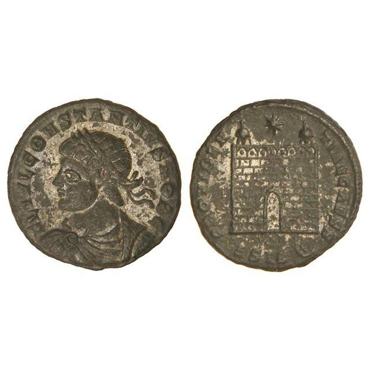 Follis 19 mm. - Acuñada el 324-325 d.C. - CONSTANCIO II. - Rev.: PROVIDENTIAE CAESS. En exergo: ¶SIS (creciente). Entrada de campamento. Dos torreones arriba. Restos de plateado original. C-167. EBC. - -
