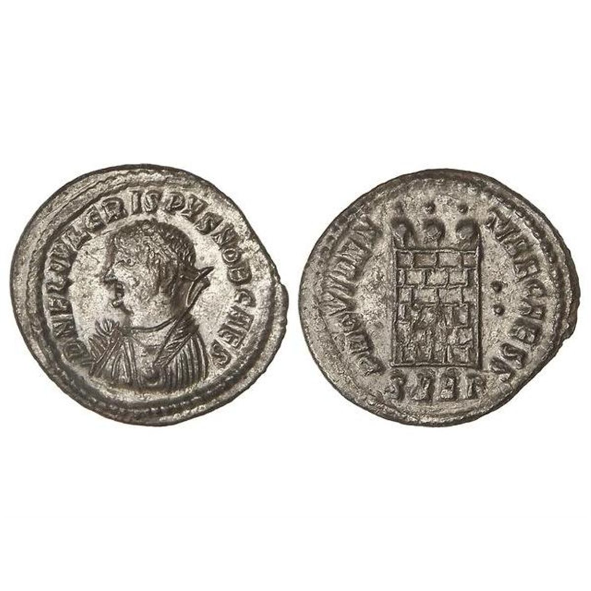 Follis 19 mm. - Acuñada el 325-326 d.C. - CRISPO. - Anv.: FL. IVL. CRISPVS NOB. CAES. Busto laureado a izquierda. Rev.: PROVIDENTIAE CAESS. En exergo: SMN¶. En campo 2 puntos. Entrada de campamento rematado por 3 torreones. Plateado original. C-122 var. EBC. - -