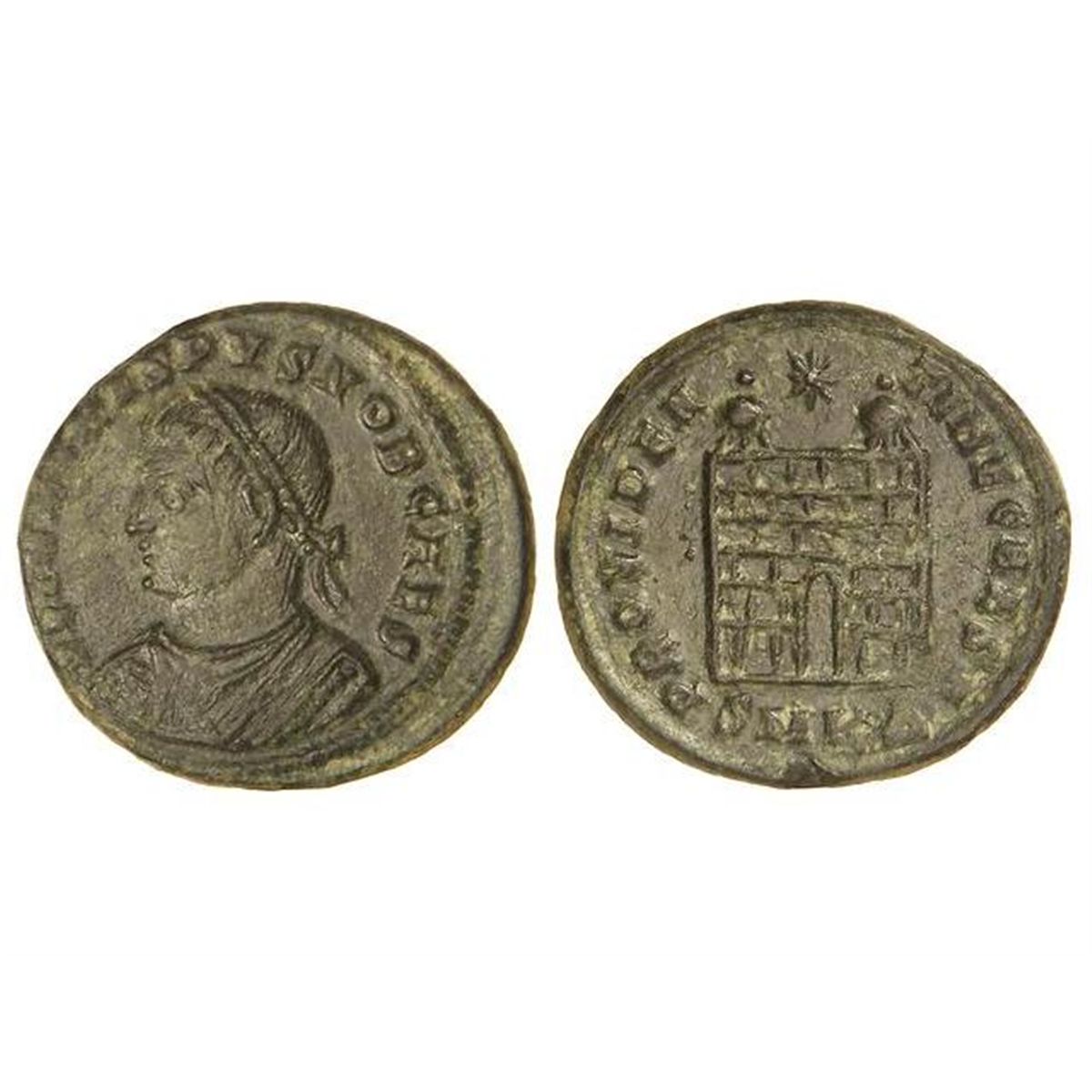 Follis 19 mm. - Acuñada el 325-326 d.C. - CRISPO. - Rev.: PROVIDENTIAE CAESS. En exergo: SMKA. Entrada de campamento con dos torreones; arriba estrella. C-122. MBC+. - -