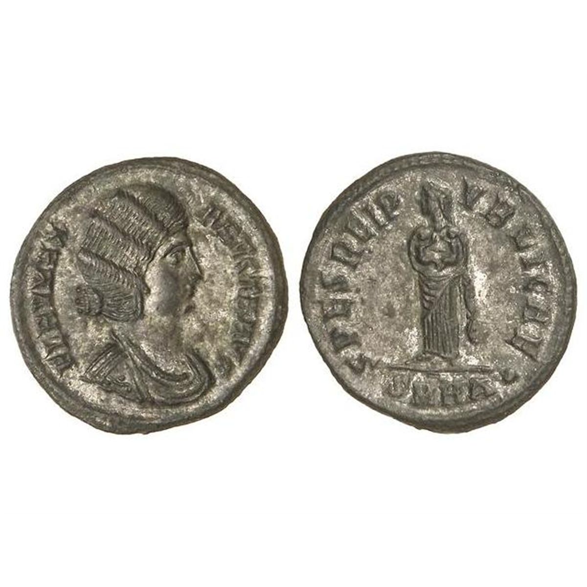 Follis 19 mm. - Acuñada el 325-326 d.C. - FAUSTA. - Rev.: SPES REI PVBLICAE. En exergo: SMHA¶. Fausta a izquierda con sus hijos en brazos. (Restos de plateado original). C-15. EBC. - -