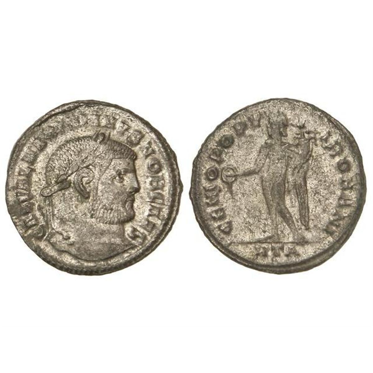 Follis. - Acuñada el 294 d.C. - GALERIO MAXIMIANO. - Rev.: GENIO POPVLI ROMANI. HTA. Genio en pie a izquierda con pátera y cornucopia. 9,10 grs. AE. Plateado original. C-78. EBC-/MBC+. - -
