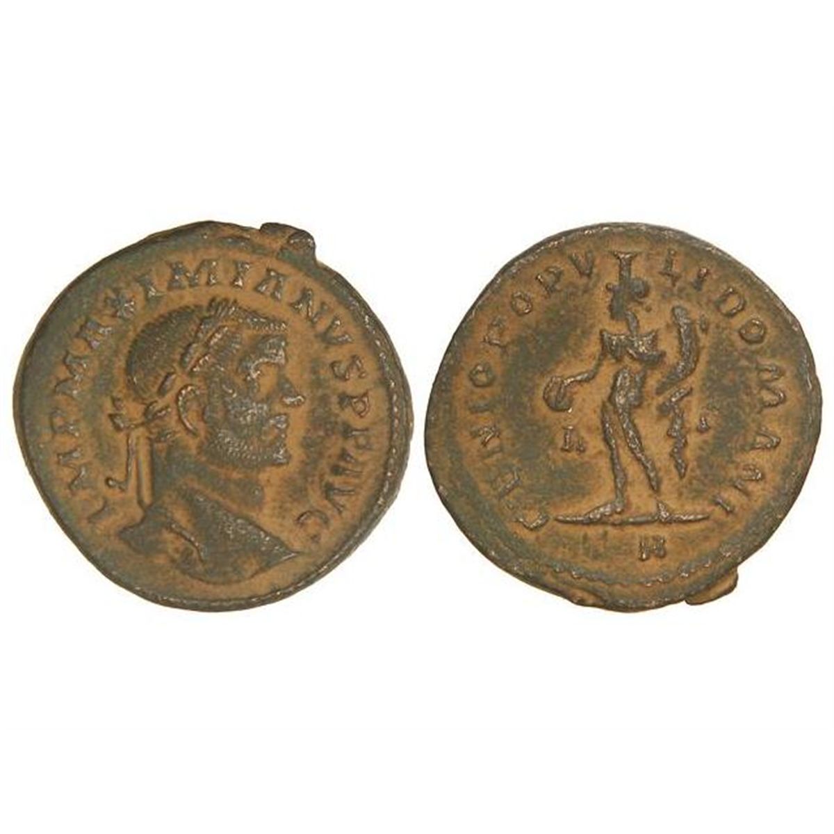 Follis. - Acuñada el 301-303 d.C. - MAXIMIANO HÉRCULES. - Anv.: IMP. MAXIMIANVS P. AVG. Busto larueado a derecha. Rev.: GENIO POPVLI ROMANI. Genio estante a izquierda portando pátera y cornucopia. 8,70 grs. Pátina verde. C-156. MBC+. - -