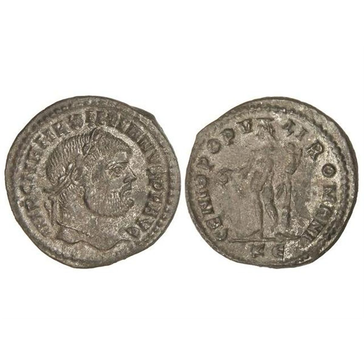 Follis. - Acuñada el 305-306 d.C. - GALERIO MAXIMIANO. - Rev.: GENIO POPVLI ROMANI KE. Genio en pie a izquierda conpátera y cornucopia. 7,60 grs. AE. Pátina marrón. C-80 sim. MBC+. - -