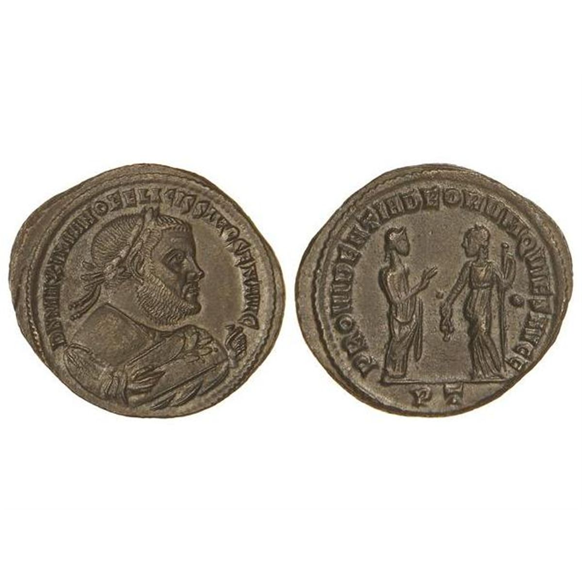 Follis. - Acuñada el 305-306 d.C. - MAXIMIANO HÉRCULES. - Rev.: PROVIDENTIA DEORVM QVIES AVGG. PT. Tranquilidad y Providencia en pie frente a frente. 9,40 grs. AE. Pátina oscura. C-489. EBC/EBC-. - -