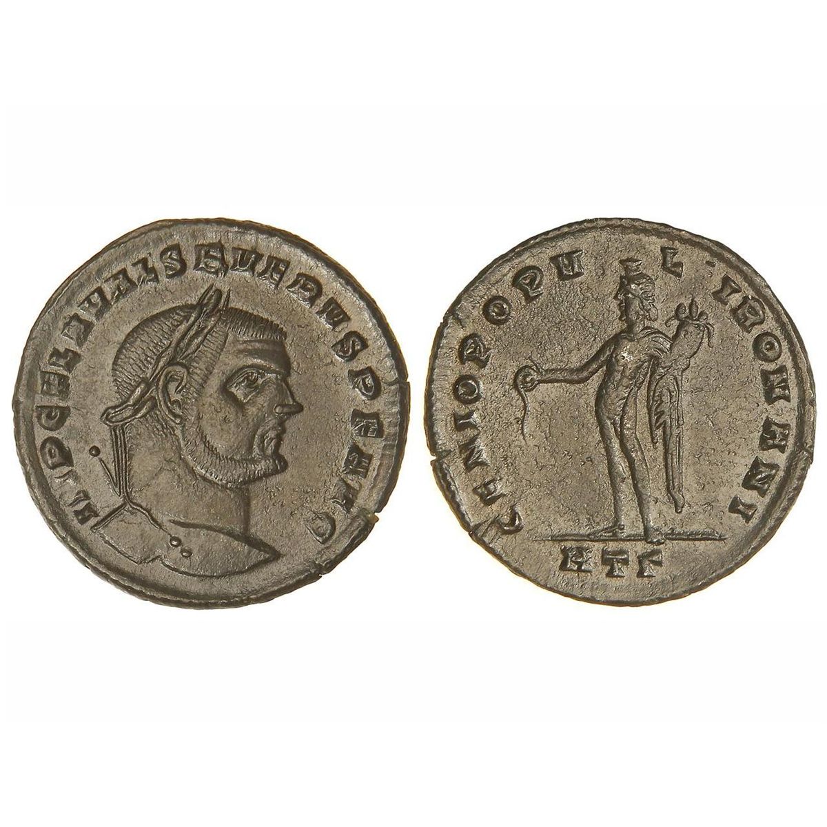 Follis. - Acuñada el 306-307 d.C. - SEVERO II. - Anv.: IMP. C. FLA. VAL. SEVERVS P. F. AVG. Busto laureado a derecha. Rev.: GENIO POPVLI ROMANI. HT¶. Genio en pie a izquierda con pátera y cornucopia. 9,40 grs. AE. Pátina negra. C-31. EBC-. - -