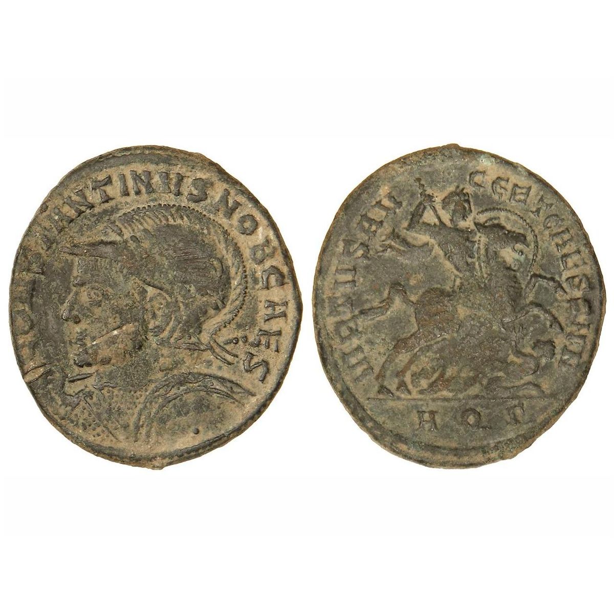 Follis. - Acuñada el 307 d.C. - CONSTANTINO I. - Anv.: CONSTANTINVS NOB. CAES. Busto larueado a izquierda con coraza y casco. Rev.: VIRTVS AVGG. ET. CAESS. NN. AQ¶. Príncipe a caballo a derecha alanceando a enemigo. 8,90 grs. (Raya en anverso). MUY ESCASA. C-673. MBC+. - -